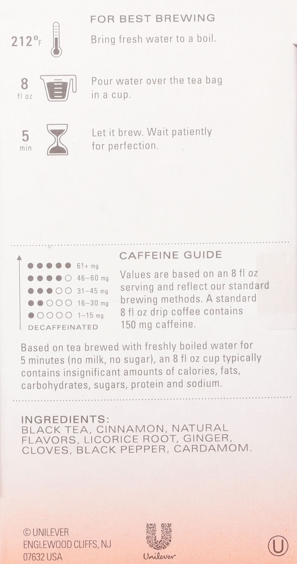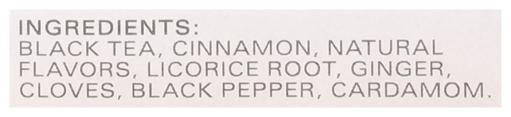 Ingredients: Black Tea, Cinnamon, Natural Flavors, Licorice Root, Ginger, Cloves, Black Pepper, Cardamom