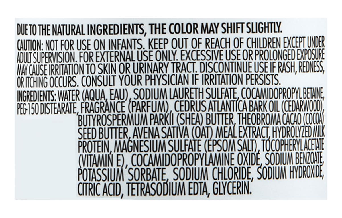 Ingredients: Water (Aqua, Eau), Sodium Laureth Sulfate, Cocamidopropyl Betaine, PEG-150 Distearate, Fragrance (Parfum), Cedrus Atlantica Bark Oil (Cedarwood), Butyrospermum Parkii (Shea) Butter, Theobroma Cacao (Cocoa), Seed Butter, Avena Sativa (Oat) Meal Extract, Hydrolyzed Milk Protein, Magnesium Sulfate (Epsom Salt), Tocopheryl Acetate (Vitamin E), Cocamidopropylamine Oxide, Sodium Benzoate, Potassium Sorbate, Sodium Chloride, Sodium Hydroxide, Citric Acid, Tetrasodium EDTA, Glycerin Contains: Tree Nuts, Sheanuts, Oat, Milk