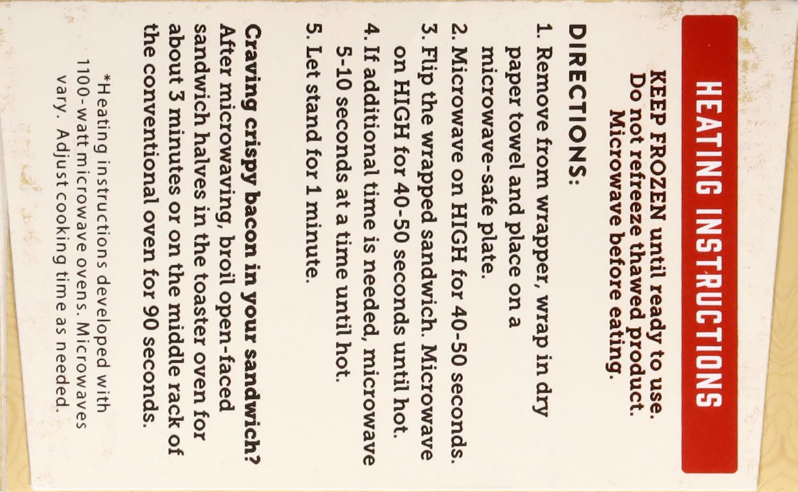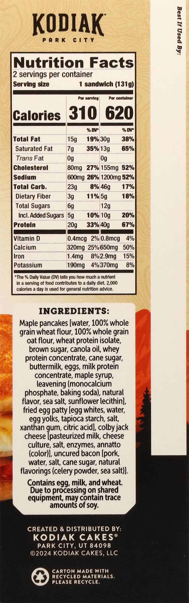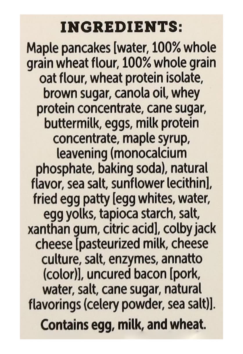 Ingredients: Maple Pancakes [Water, 100% Whole Grain Wheat Flour, 100% Whole Grain Oat Flour, Wheat Protein Isolate, Brown Sugar, Canola Oil, Whey Protein Concentrate, Cane Sugar, Buttermilk, Eggs, Milk Protein Concentrate, Maple Syrup, Leavening (Monocalcium Phosphate, Baking Soda), Natural Flavor, Sea Salt, Sunflower Lecithin], Fried Egg Patty [Egg Whites, Water, Egg Yolks, Tapioca Starch, Salt, Xanthan Gum, Citric Acid], Colby Jack Cheese [Pasteurized Milk, Cheese Culture, Salt, Enzymes, Annatto (Color)], Uncured Bacon [Pork, Water, Salt, Cane Sugar, Natural Flavorings (Celery Powder, Sea Salt)] Contains: Wheat, Oat, Eggs, Milk, Celery, Soybeans