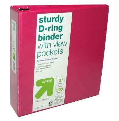 Keep it all together with the up & up 2 " Durable Ring Binder - Clear View. This smartly designed D-ring binder can hold more pages than a traditional round ring binder, giving you more room to store and organize your important documents. In addition to the center storage you expect from a ring binder, internal pockets let you store other objects that just don't lend themselves to hole punches. Color: Pink