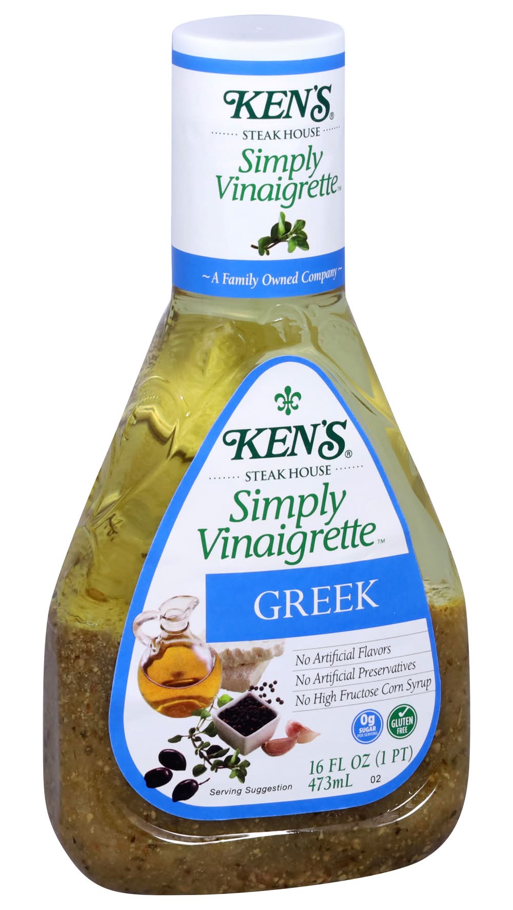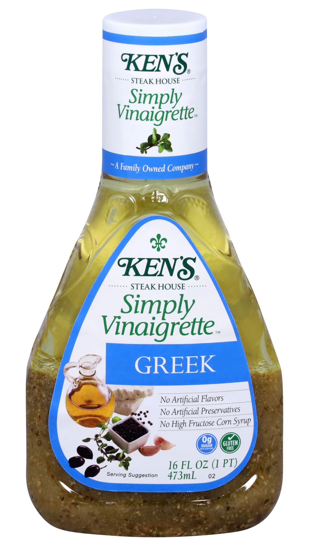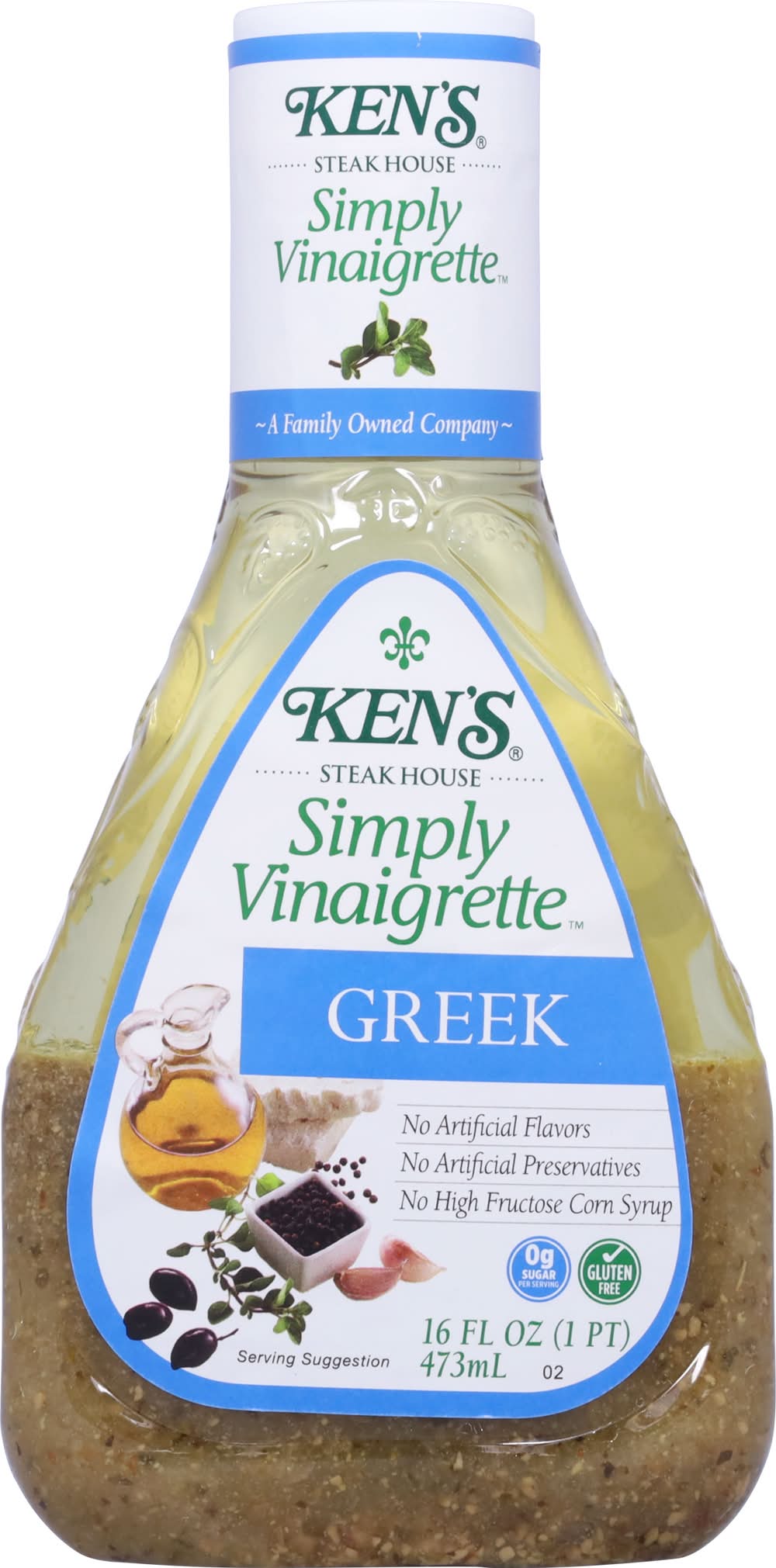 Ken's Simply Vinaigrette Greek Dressing is the essence of the Mediterranean! This vinaigrette is made from just a few essential ingredients, including aromatic vinegars and extra-virgin olive oil. Toss with Kalamata olives, tomatoes, and feta for salad worthy of a Greek taverna. Drizzle on pita bread sandwiches stuffed with cubed meat and vegetables. Or use it as a marinade for lamb and freshly caught seafood. Gluten-free with no artificial flavors or high-fructose corn syrup. Shake well before use and refrigerate after opening. • Flavor: Greek • Ken's Foods, Inc., Marlborough, MA, 01752 • Packaging: Reusable