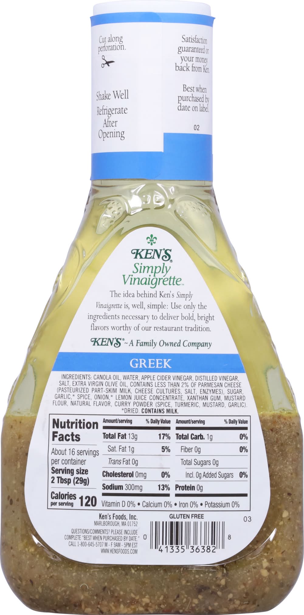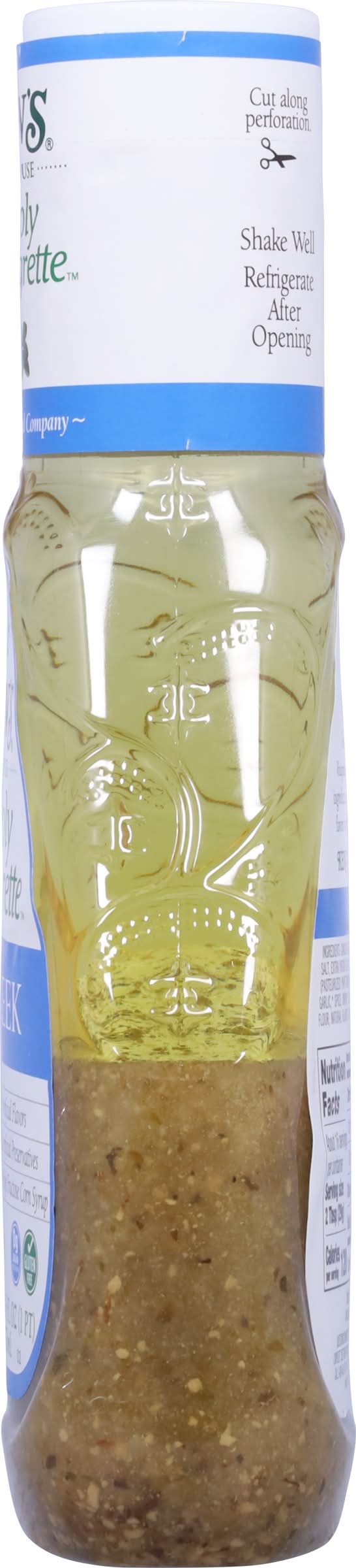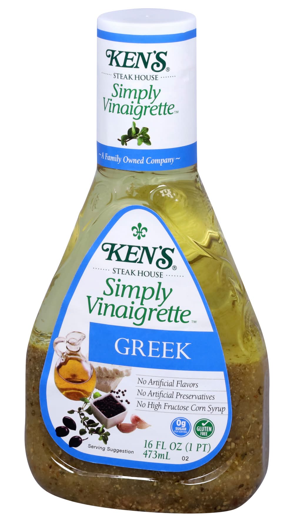 Ken's Simply Vinaigrette Greek Dressing is the essence of the Mediterranean! This vinaigrette is made from just a few essential ingredients, including aromatic vinegars and extra-virgin olive oil. Toss with Kalamata olives, tomatoes, and feta for salad worthy of a Greek taverna. Drizzle on pita bread sandwiches stuffed with cubed meat and vegetables. Or use it as a marinade for lamb and freshly caught seafood. Gluten-free with no artificial flavors or high-fructose corn syrup. Shake well before use and refrigerate after opening. • Flavor: Greek • Ken's Foods, Inc., Marlborough, MA, 01752 • Packaging: Reusable