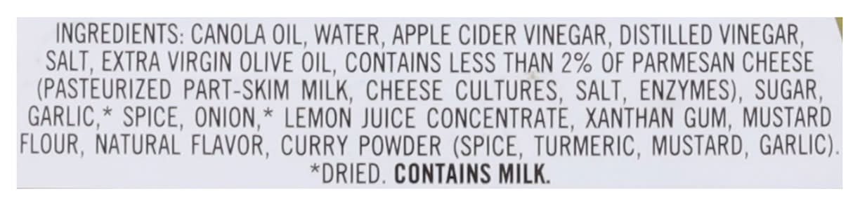 Ingredients: Canola Oil, Water, Apple Cider Vinegar, Distilled Vinegar, Salt, Extra Virgin Olive Oil, Contains Less than 2% of Parmesan Cheese (Pasteurized Part-Skim Milk, Cheese Cultures, Salt, Enzymes), Sugar, Garlic, * Spice, Onion, * Lemon Juice Concentrate, Xanthan Gum, Mustard Flour, Natural Flavor, Curry Powder (Spice, Turmeric, Mustard, Garlic). * Dried Contains: Milk, Mustard