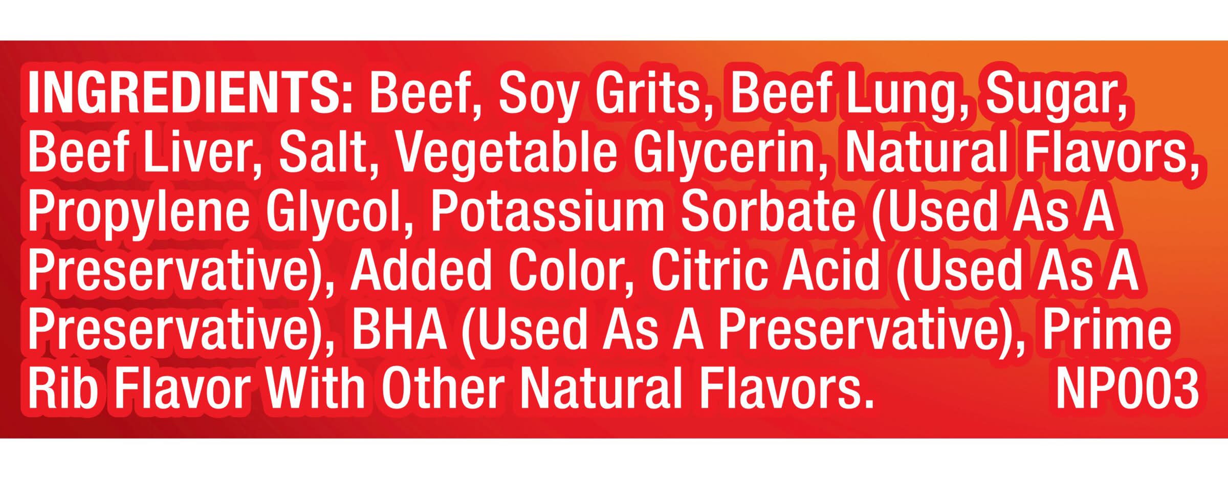 Ingredients: Beef, Soy Grits, Beef Lung, Sugar, Beef Liver, Salt, Vegetable Glycerin, Natural Flavors, Propylene Glycol, Potassium Sorbate (Used As A Preservative), Added Color, Citric Acid (Used As A Preservative), Bha (Used As A Preservative), Prime Rib Flavor With Other Natural Flavors Contains: Soybeans
