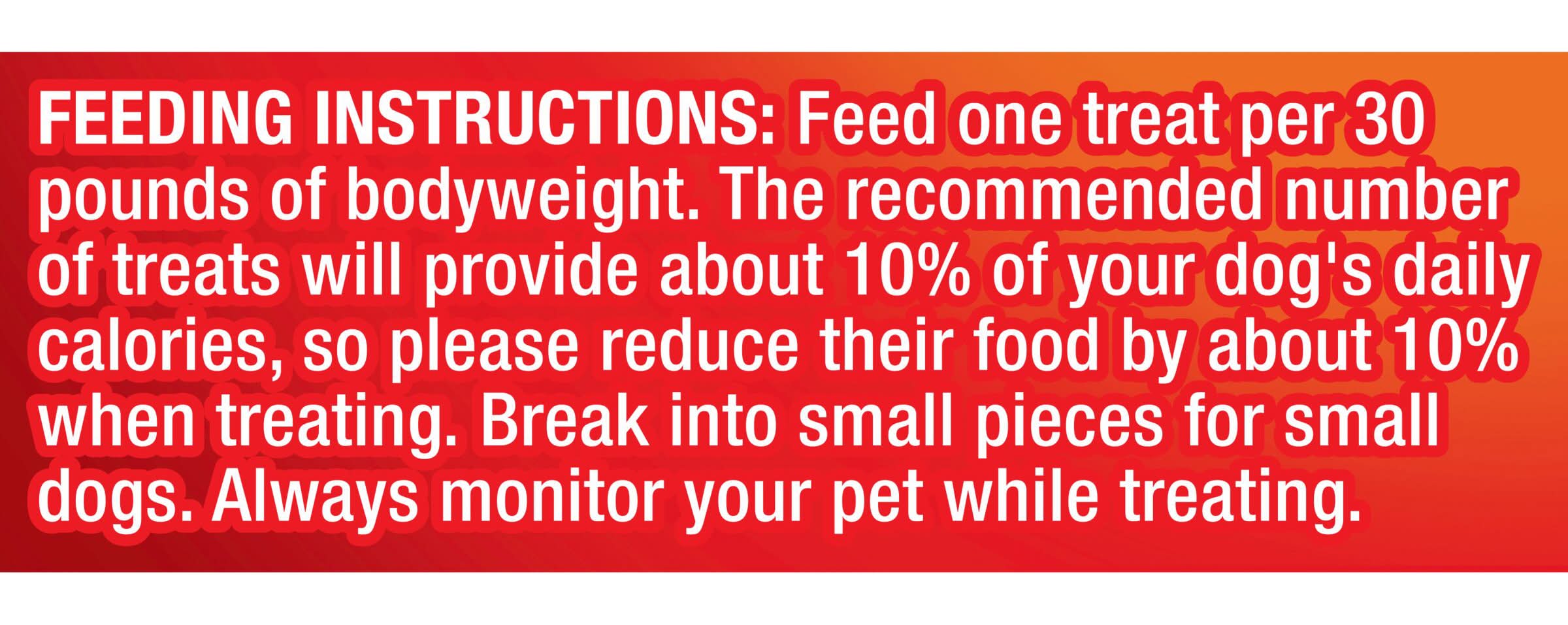 Directions for use: Feeding Instructions: Feed as a snack or treat, as part of a healthy diet. Break into small pieces for small dogs. Always monitor your pet while treating. Storage recommendation: Store in a cool, dry place.