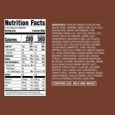 Enjoy the taste of classic street food in convenient miniature form with these Frozen Beef & Jalapeno Mini Empanadas from Good & Gather™. Consisting of a bold beef and jalapeno pepper filling inside soft pastry dough, these mini empanadas are made with no artificial flavors or synthetic colors. They are perfect as an appetizer for family gatherings or on game day, and can also be paired with an entrée for an extra-special lunch or dinner. The 8-count pack is great to keep on hand in the freezer for an impromptu gathering, and you can also mix and match with other bites for more snacking fun. Every product that carries the Good & Gather™ name starts with quality ingredients that deliver great taste, making it easier for you and your family to eat well, every day. We promise you’ll love each bite, or your money back. Directions Appetizers need to be fully cooked. Keep frozen until ready to prepare. Oven 1. Preheat oven to 400°F. 2. Remove appetizers from packaging. Arrange at least ½ inch apart on rimmed baking pan (line with parchment paper for easy cleanup). 3. Bake on center oven rack 11 to 12 minutes or until hot throughout, turning over halfway through. For food safety, bake to 165°F throughout. Ovens may vary; adjust times accordingly. Refrigerate or discard leftovers immediately. Do not microwave or cook in a toaster oven.