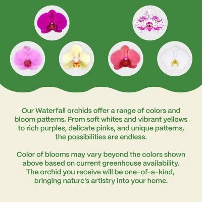 Add beauty to your home with the Just Add Ice 5-inch Waterfall orchid. The variety of colors help this stunning plant become a beautiful addition to any space in your home or office and are air-purifying. In a gorgeous decorative pot, the long-lasting, orchid plant is a sophisticated and elegant choice for plant decorations. Orchids are easy to care for, making it a great plant to keep or give as a gift. Care Instructions: Water each orchid once a week with 5 ice cubes or 1/2 cup of water. Keep in bright, indirect light. Temperatures in the room should remain between 65 degrees F to 85 degrees F, never below 55 degrees F. Avoid placing near drafts. Color: May vary