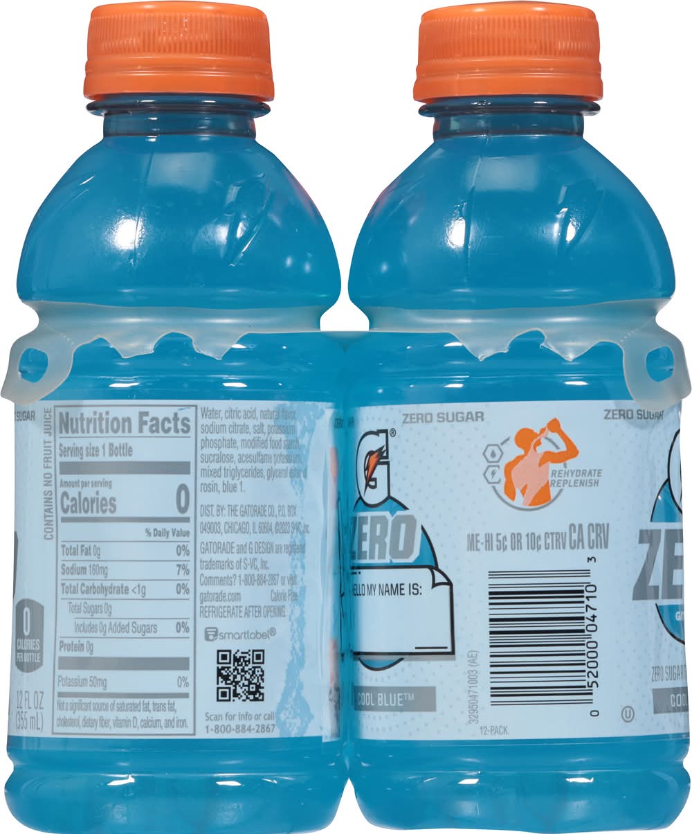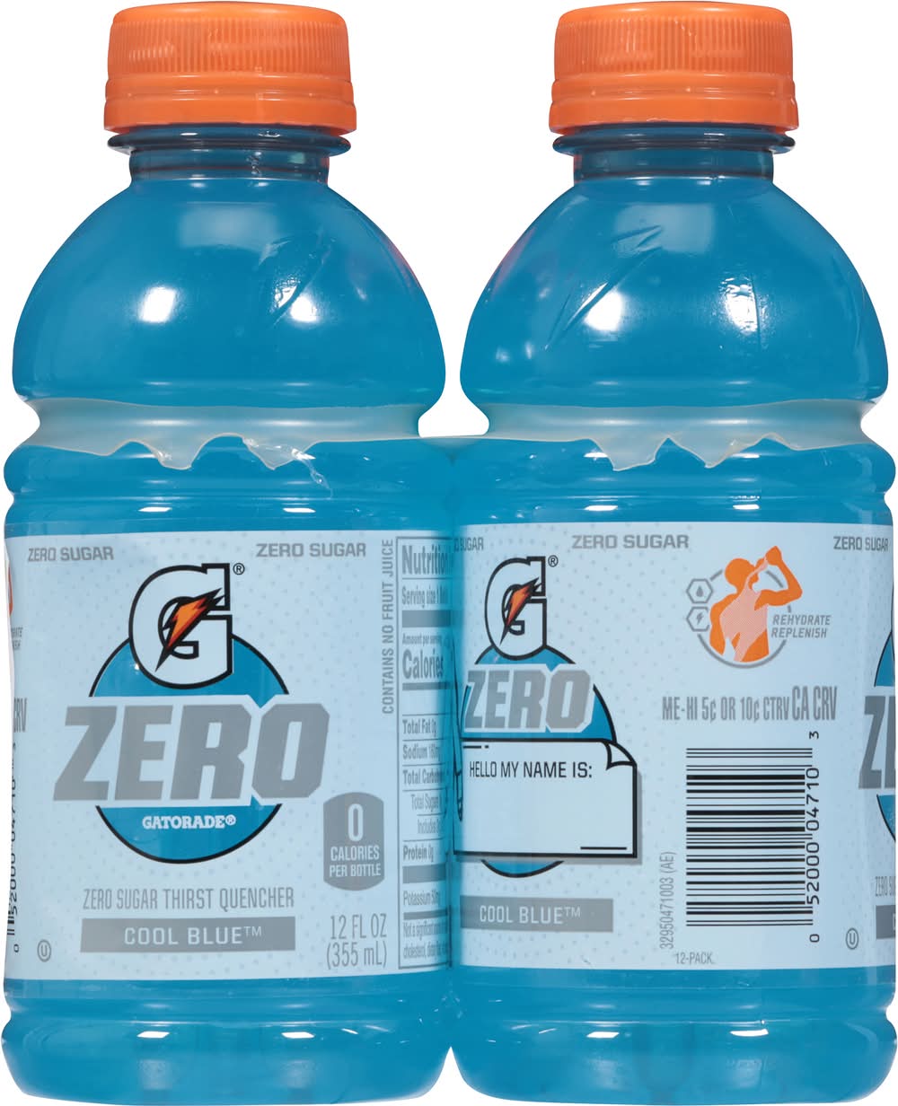 Gatorade Zero is developed for athletes that prefer a performance boost and not a sugar rush. Gatorade Zero has no sugar while maintaining the same proven hydration and fueling benefits of Gatorade Thirst Quencher. With refreshing flavors to keep you in the game, you won't even miss what's missing. Grab one today. • Flavor: Cool blue • Pack size: 12 • GATORADE, Chicago, IL, 60604, Ph: 800-884-2867