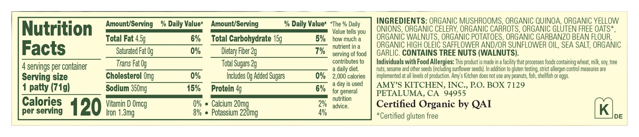 Ingredients: ORGANIC QUINOA, ORGANIC GLUTEN FREE OATS*, ORGANIC WALNUTS, ORGANIC MUSHROOMS, ORGANIC POTATOES, ORGANIC GARBANZO BEAN FLOUR, ORGANIC ONIONS, SEA SALT. ORGANIC CELERY, ORGANIC CARROTS, ORGANIC GARLIC, ORGANIC HIGH OLEIC SAFFLOWER AND/OR SUNFLOWER OIL. CONTAINS TREE NUTS (WALNUTS). *Certified gluten free Contains: <b>INGREDIENTS: </b>ORGANIC MUSHROOMS, ORGANIC QUINOA, ORGANIC YELLOW ONIONS, ORGANIC CELERY, ORGANIC CARROTS, ORGANIC GLUTEN FREE OATS*, ORGANIC WALNUTS, ORGANIC POTATOES, ORGANIC GARBANZO BEAN FLOUR, ORGANIC HIGH OLEIC SAFFLOWER AND/OR SUNFLOWER OIL, SEA SALT, ORGANIC GARLIC. <strong>CONTAINS TREE NUTS (WALNUTS).</strong> *Certified gluten free