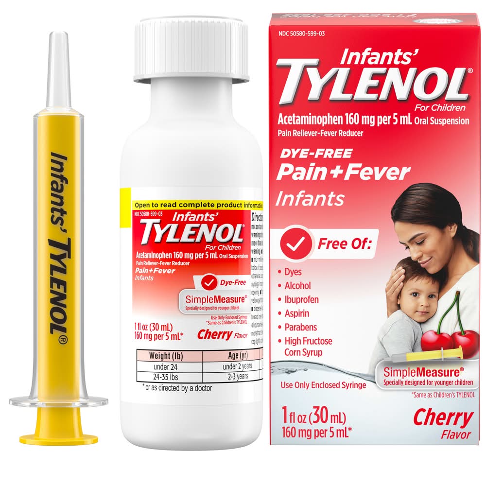 Infants' Tylenol Oral Suspension with Dye-Free Cherry flavor provides temporary pain relief from your child's minor aches and pains due to the common cold, flu, sore throat, headache and toothache. The dye-free formula of this liquid medicine also temporarily reduces fever and starts working to relieve symptoms in as little as 15 minutes. Each 5-milliliter dose contains 160 milligrams of acetaminophen, a known pain reliever and fever reducer. Infants' Tylenol is the #1 pediatrician-recommended brand for infant teething pain, is ibuprofen-, aspirin- and alcohol-free, and is gentle on little tummies with a kid-friendly cherry flavor. It includes a SimpleMeasure syringe with dosing for children 2 to 3 years of age. For dosing information for children 2 years and under, ask your healthcare professional. Help provide relief for your baby with Tylenol, the #1 pediatrician-recommended brand of pain reliever and fever reducer. Johnson & Johnson Consumer Inc., 199 Grandview Road Skillman, NJ 08558