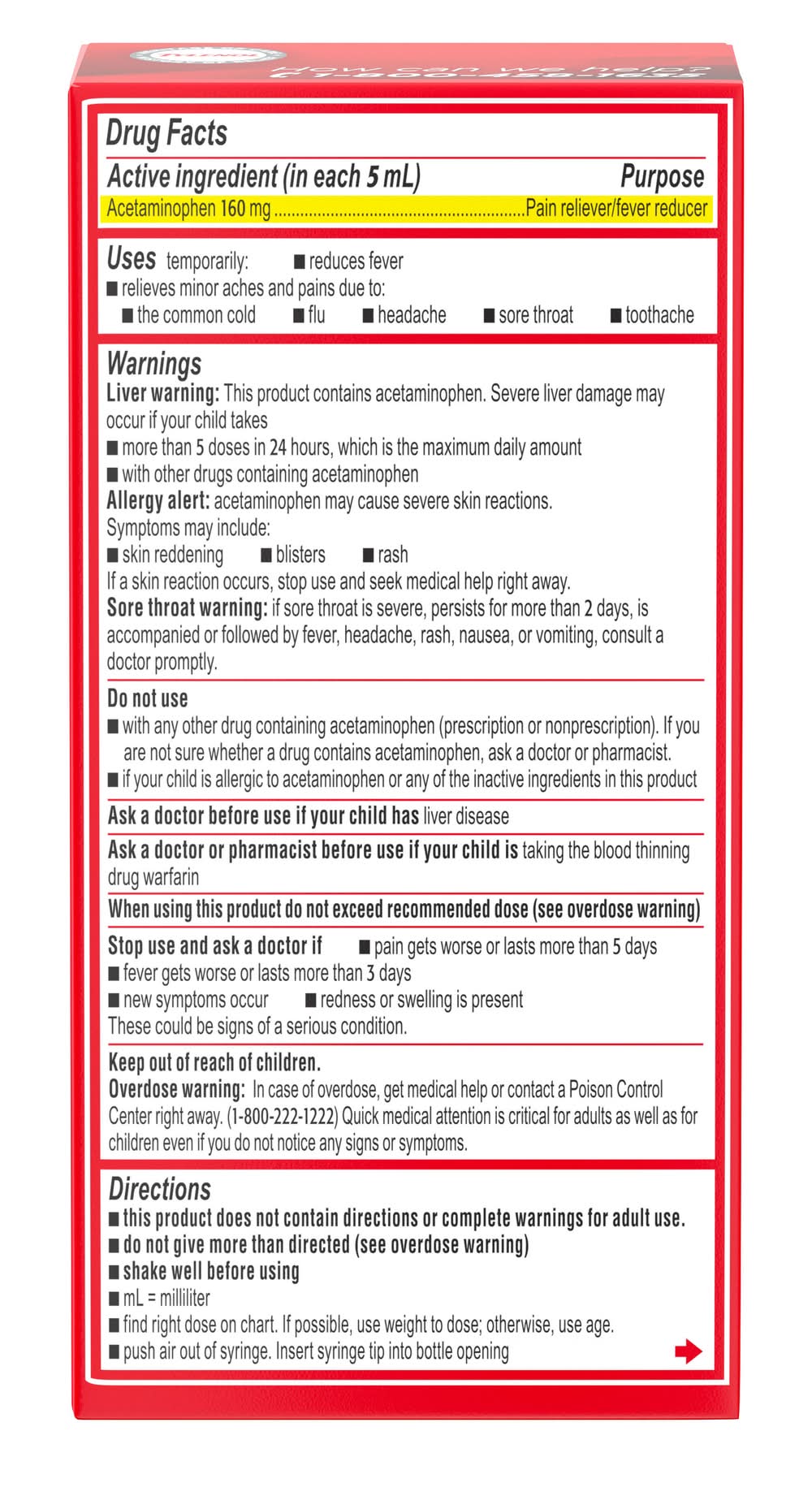 Ingredients: In Each 5 mL Active Ingredients: Acetaminophen (160 mg), Flavors, Glycerin, Microcrystalline Cellulose and Carboxymethylcellulose Sodium, Potassium Sorbate, Purified Water, Sorbitol Solution, Sucralose, Sucrose, Pain Reliever/Fever Reducer, Xanthan Gum, Inactive Ingredients: Anhydrous Citric Acid