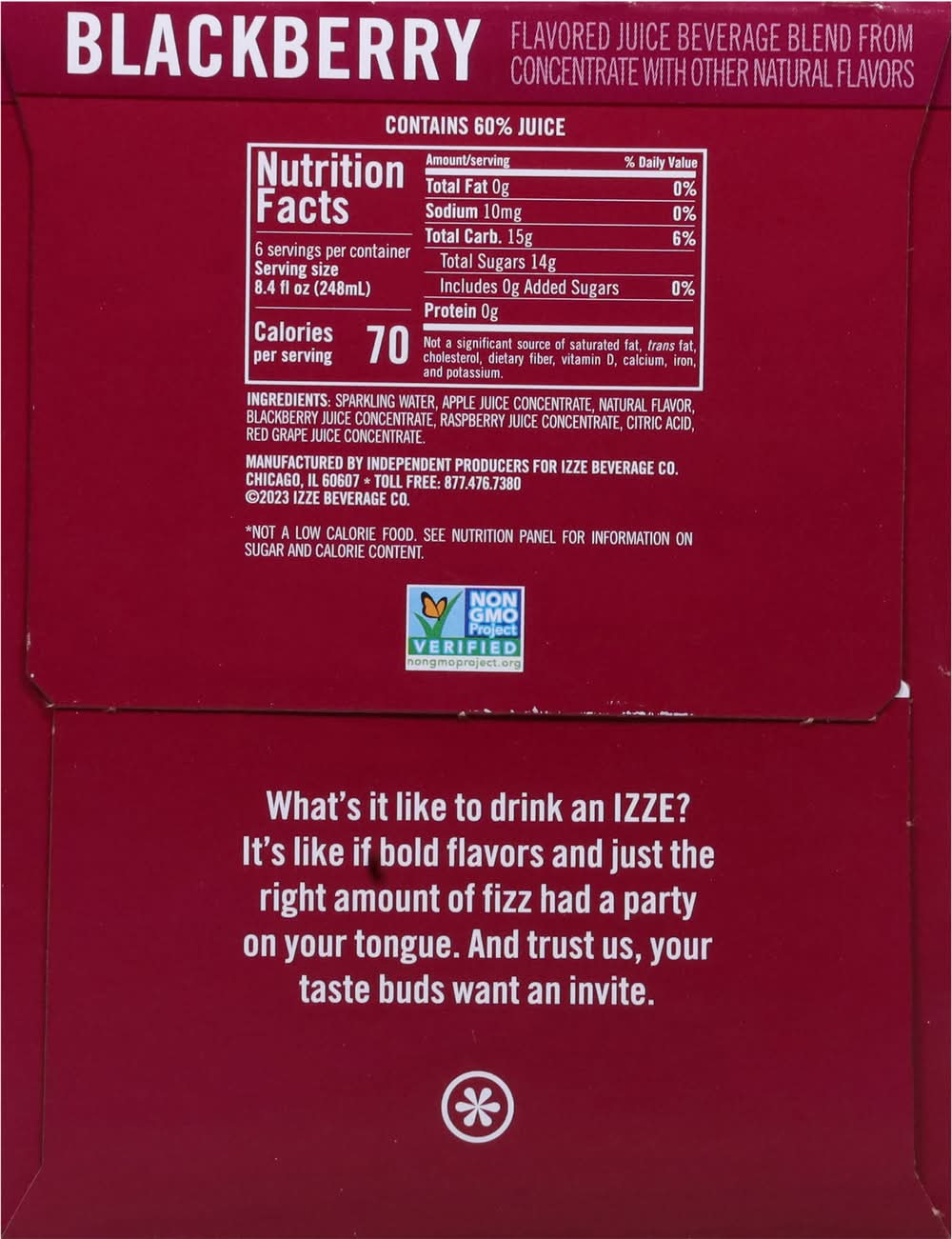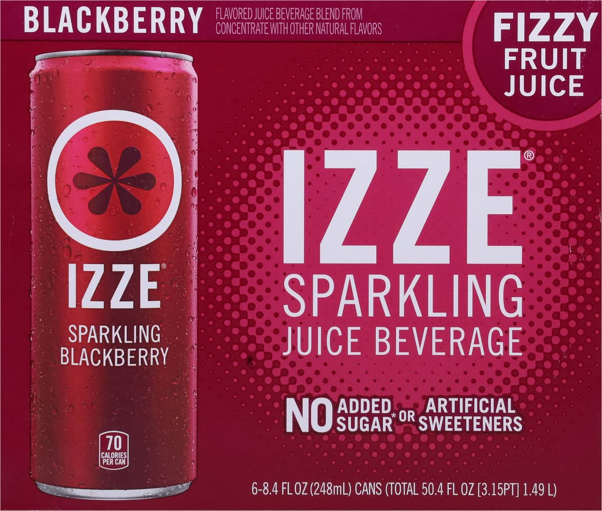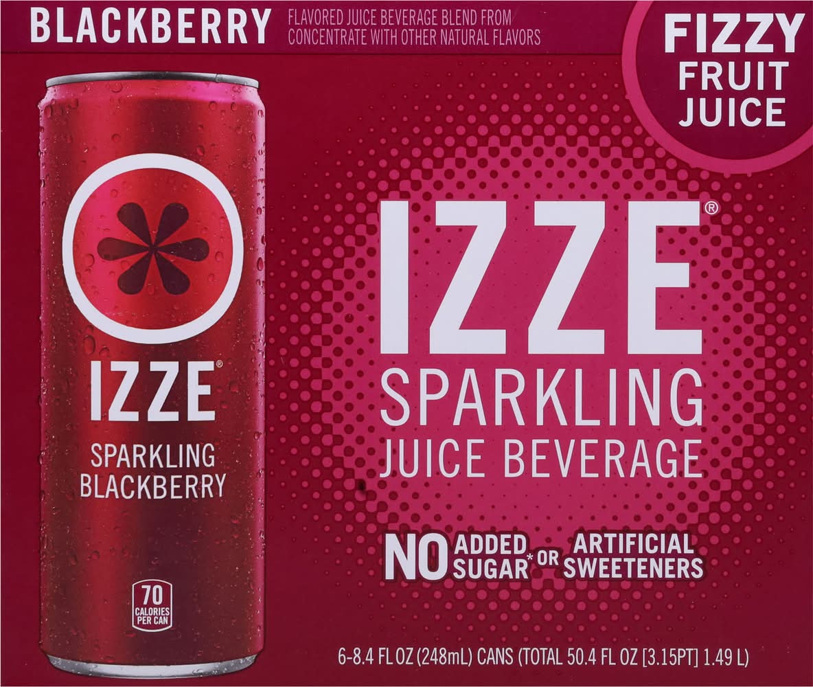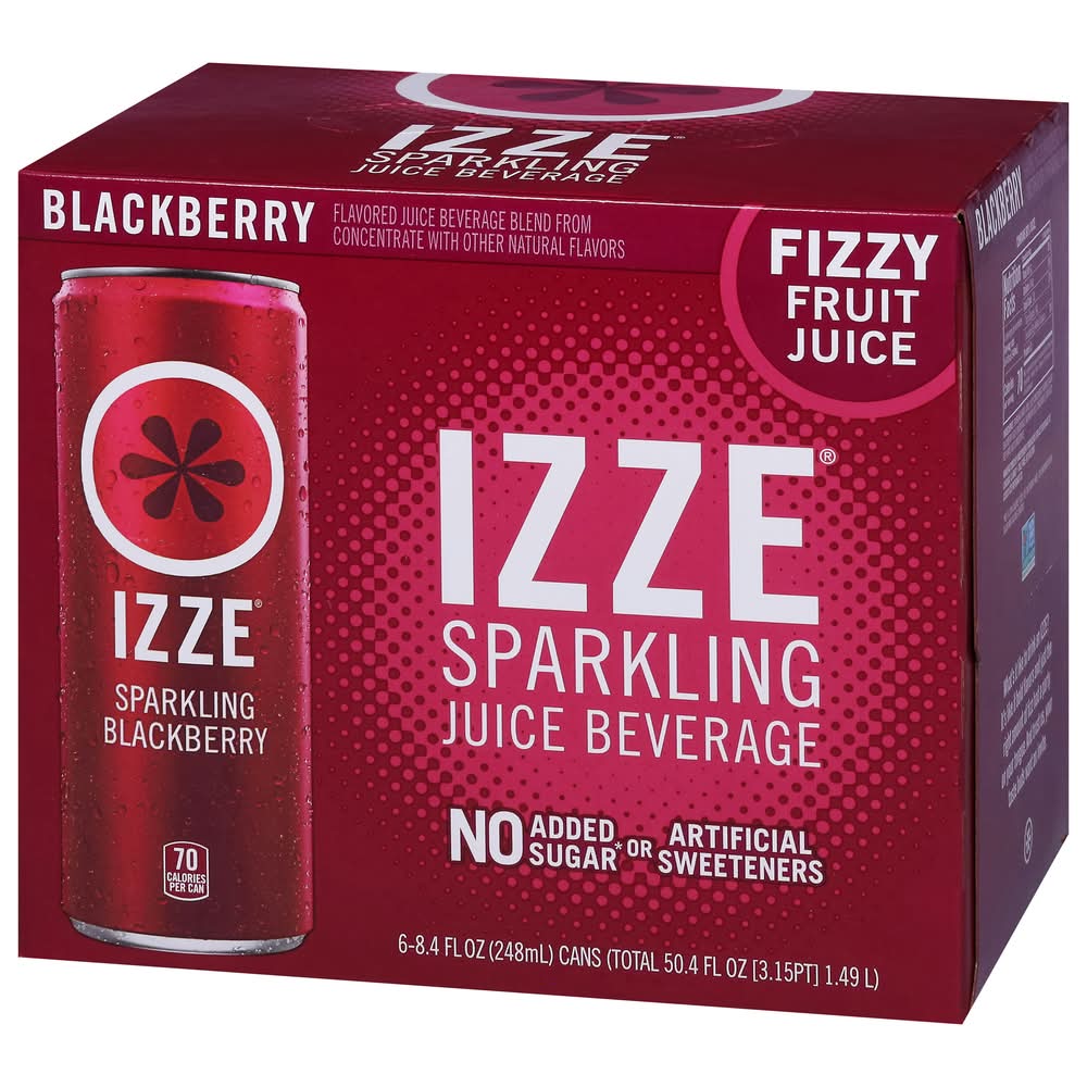 IZZE Blackberry Sparkling Juice beverage blend is sweet, snappy, bubbly and fizzing awesome! Full of bold flavors and with just the right amount of bubbles, drinking an IZZE is like having a party on your tongue. IZZE combines 60% real fruit juice* with a splash of bubbly H2O. At any time of day, celebrate and elevate your beverage experience with flavors ranging from peach to mango, pomegranate to apple and more. Ideal for get-togethers with family and friends, the fusion of real fruit flavors and sparkling water creates an irresistibly bold taste that sets IZZE apart. Another plus – it’s non-GMO, has no added sugar** and no artificial sweeteners. Packed with powerfully fruity taste, each 8.4 FL OZ can has 70 calories.The fabulous drink that is IZZE was born in blue-sky Boulder, Colorado. When two best friends were taking a break and having a beverage, they wondered why soda couldn’t be a bit more sophisticated. They wanted more – something that was fizzy and fun and made with real juice.* Something that would lift you up and not weigh you down with extras you don’t want. So they came up with IZZE, and the rest, as they say, is fizz-story.*Juice beverage blend from concentrate**Not a low calorie food. See nutrition information for sugar and calorie content. • Flavor: Blackberry • Pack size: 6