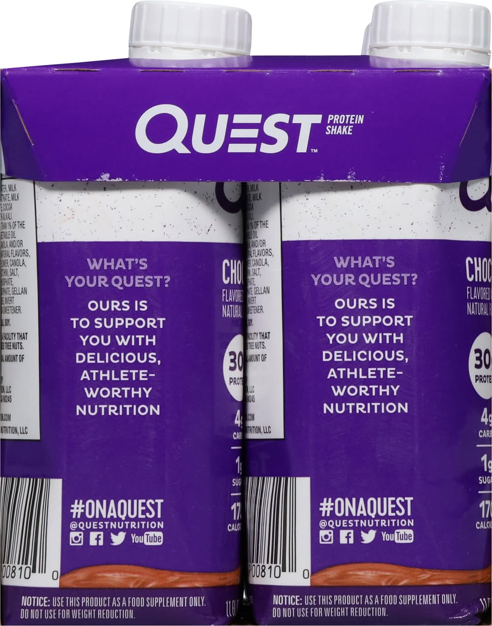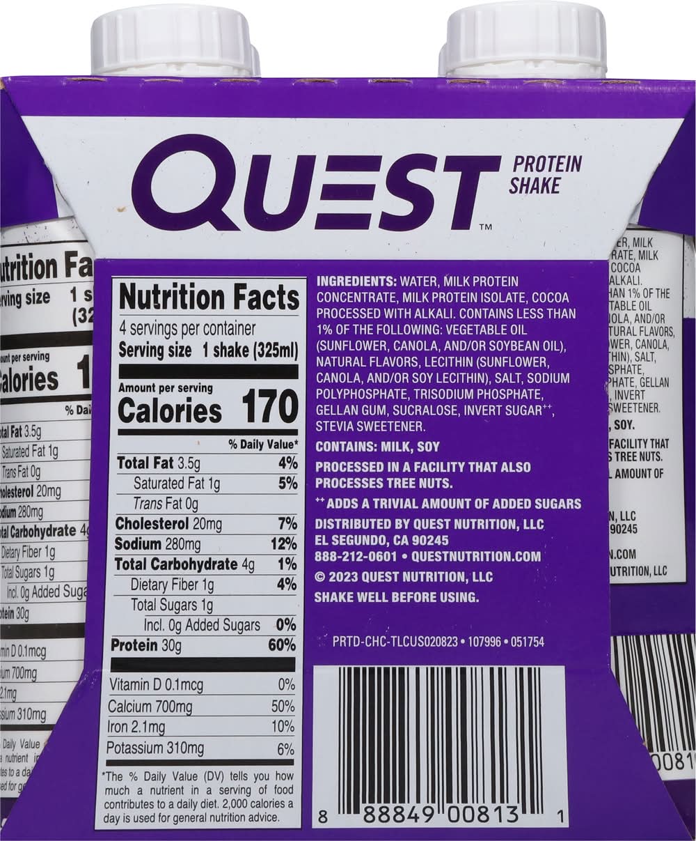 Protein Shake, Chocolate • Pack size: 4 • Quest Nutrition, LLC, El Segundo, CA, 90245 • Packaging: Reusable