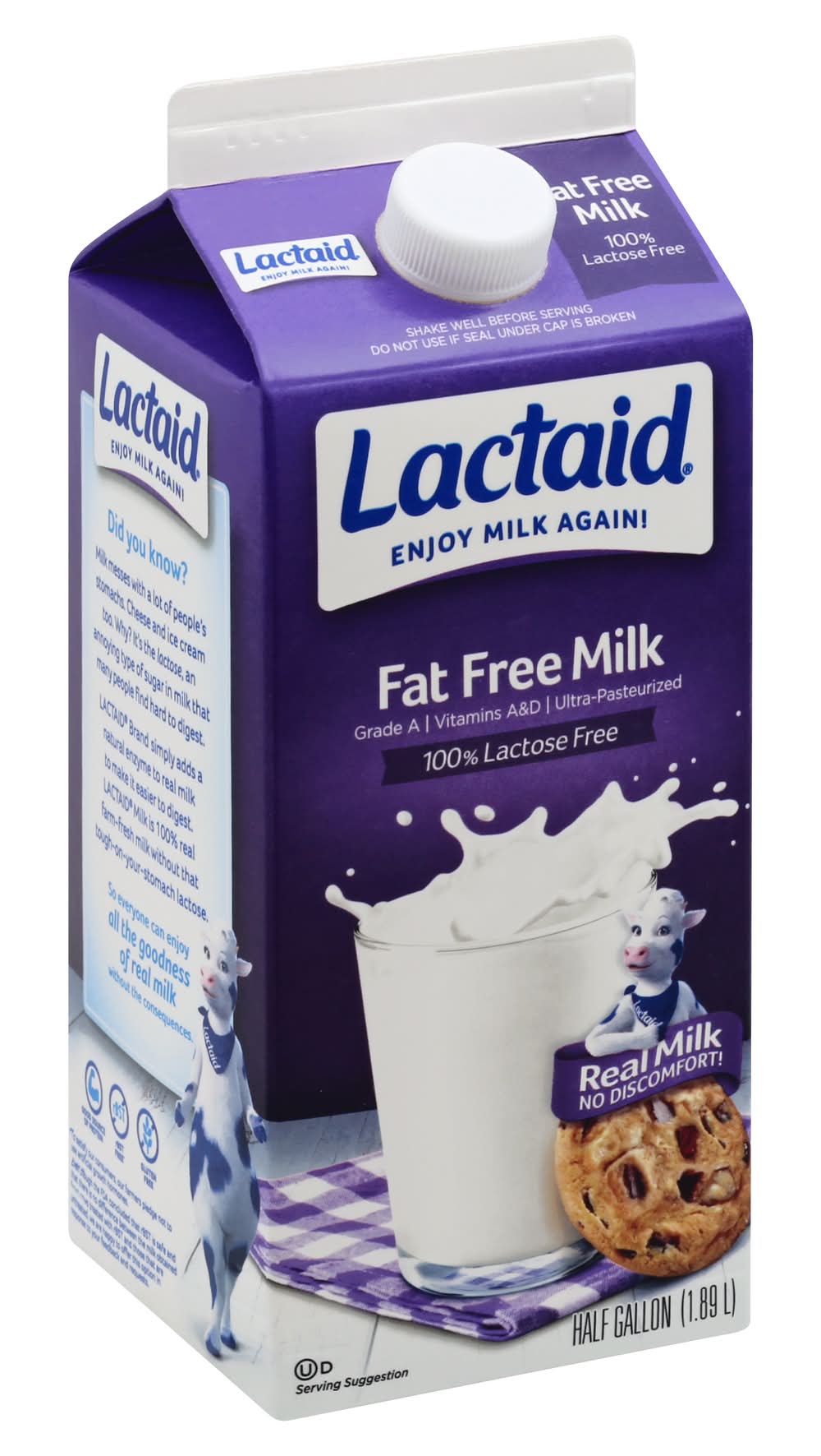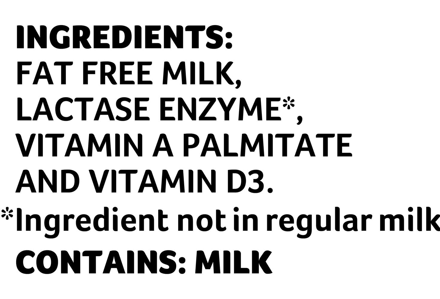 Ingredients: Fat Free Milk, Lactase Enzyme (Ingredients Not in Regular Milk), Vitamin A Palmitate and Vitamin D3. Contains: Contains: Milk.