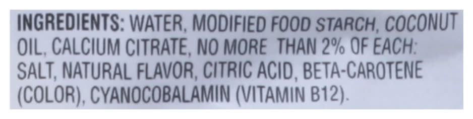 Ingredients: Water, Modified Food Starch, Coconut Oil, Calcium Citrate, No More than 2% of Each: Salt, Natural Flavor, Citric Acid, Beta-Carotene (Color), Cyanocobalamin (Vitamin B12).