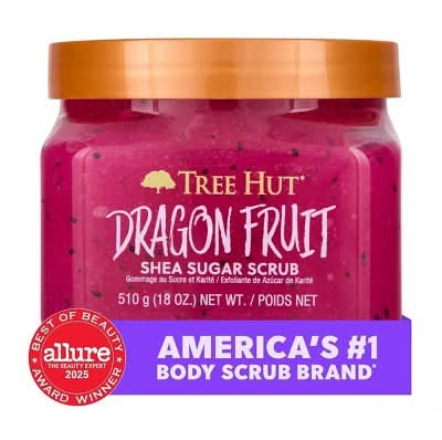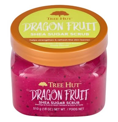 Made with Sugar, Shea Butter, Dragon Fruit Extract, Prickly Pear Oil, and our premium blend of six natural oils, this body exfoliator scrub deeply nourishes and balances skin hydration to help restore your skin's natural glow, while leaving your skin smelling amazing. The thoughtful ingredients work together to hydrate, renew, and smooth skin while removing dull, dry skin. Plus, our Dragon Fruit Sugar Scrub smells like a juicy, burst of ripe fruit with notes of fresh dragon fruit, juicy pineapples, and sweet peaches. Tree Hut Sugar Scrubs are paraben-free, vegan, sulfate-free, alcohol-free, formaldehyde-free, and have a no-slip formula with a long-lasting fragrance. Apply a generous amount to damp or dry skin, buff in circular motions, and rinse well.