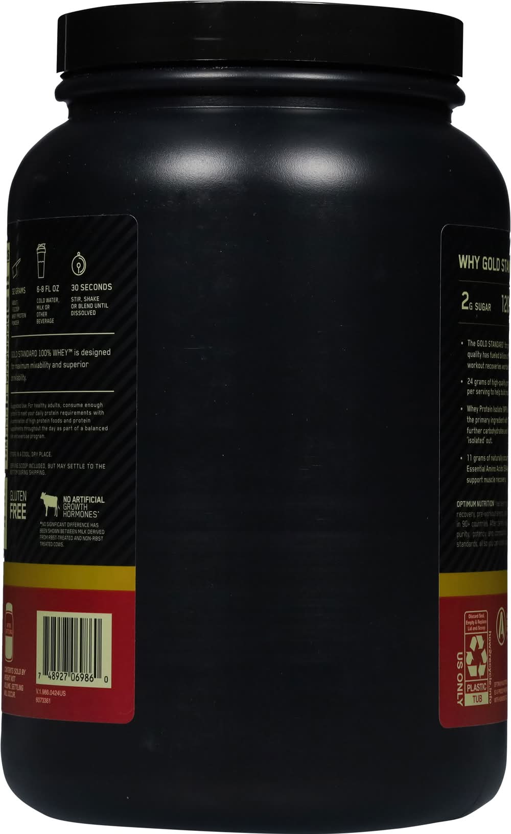 Optimum Nutrition Gold Standard 100% Whey Protein Powder helps build and maintain muscle mass when taken regularly and combined with strength training exercise. Made with whey protein isolate as the primary ingredient, this protein supplement powder ensures that you're getting high quality protein with every serving. The hydrolyzed whey protein powder isolate creates a post-workout drink mix that supports muscle recovery. Each serving of this delicious flavored protein powder provides 24 grams of all whey protein, along with 5.5 grams of branch-chained essential amino acids (BCAAs) to support after workout muscle recovery. Optimum Nutrition protein powder mixes easily using a shaker cup or blended in a smoothie. Gold Standard 100% Whey has fueled billions of workout recoveries worldwide. Packaging: Reusable