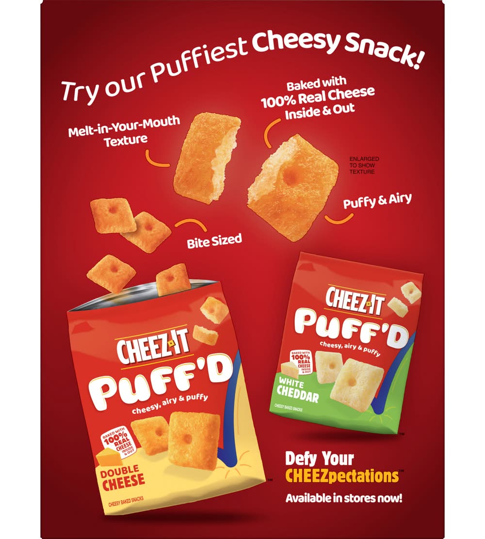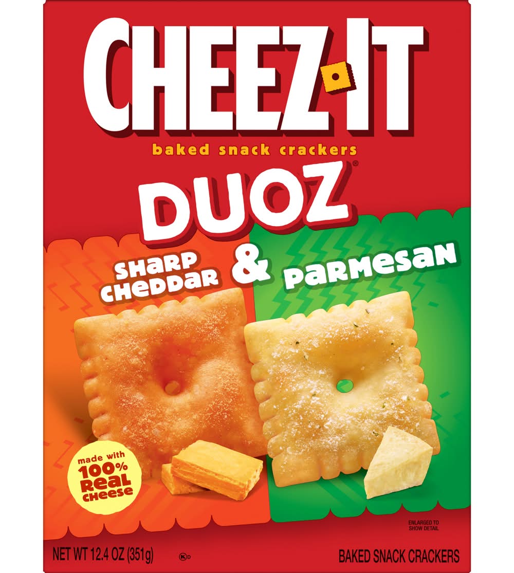Two bold flavors combined in 1 Cheez-It Duoz box? It’s an outrageously craveable combo cheese lovers can’t resist. Cheez-It Duoz Sharp Cheddar and Parmesan baked snack crackers are made with 100% real cheese, carefully aged for a one-of-a-kind taste. Bold cheddar and rich parmesan flavors pack a crunch of cheesy goodness; Cheez-It Duoz baked snack crackers are a fan-favorite for game night, school snacks, party spreads, video gaming, late-night snacking, and so much more. The cheesy options are endless! Go ahead and pick up a box of your favorite combo of cheesy snacks that’ll keep you coming back for more. Whether you're packing them in school lunches, taking some to the office, or enjoying them on a road trip, you'll find a delicious, crisp snack that's filled with big cheese flavor. You’ll love that one-of-a-kind cheesy taste in every bite of Cheez-It Duoz. Grab a handful of Cheez-It baked snack crackers and start munchin'. • Kellogg Sales Co., Seattle Creek, MI, 49016 • Packaging: Reusable