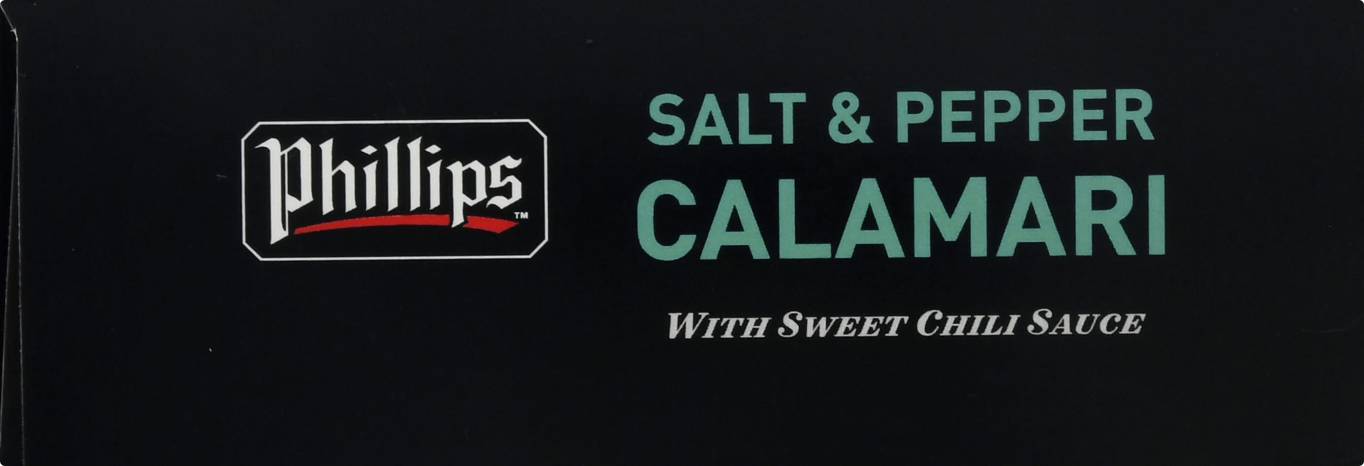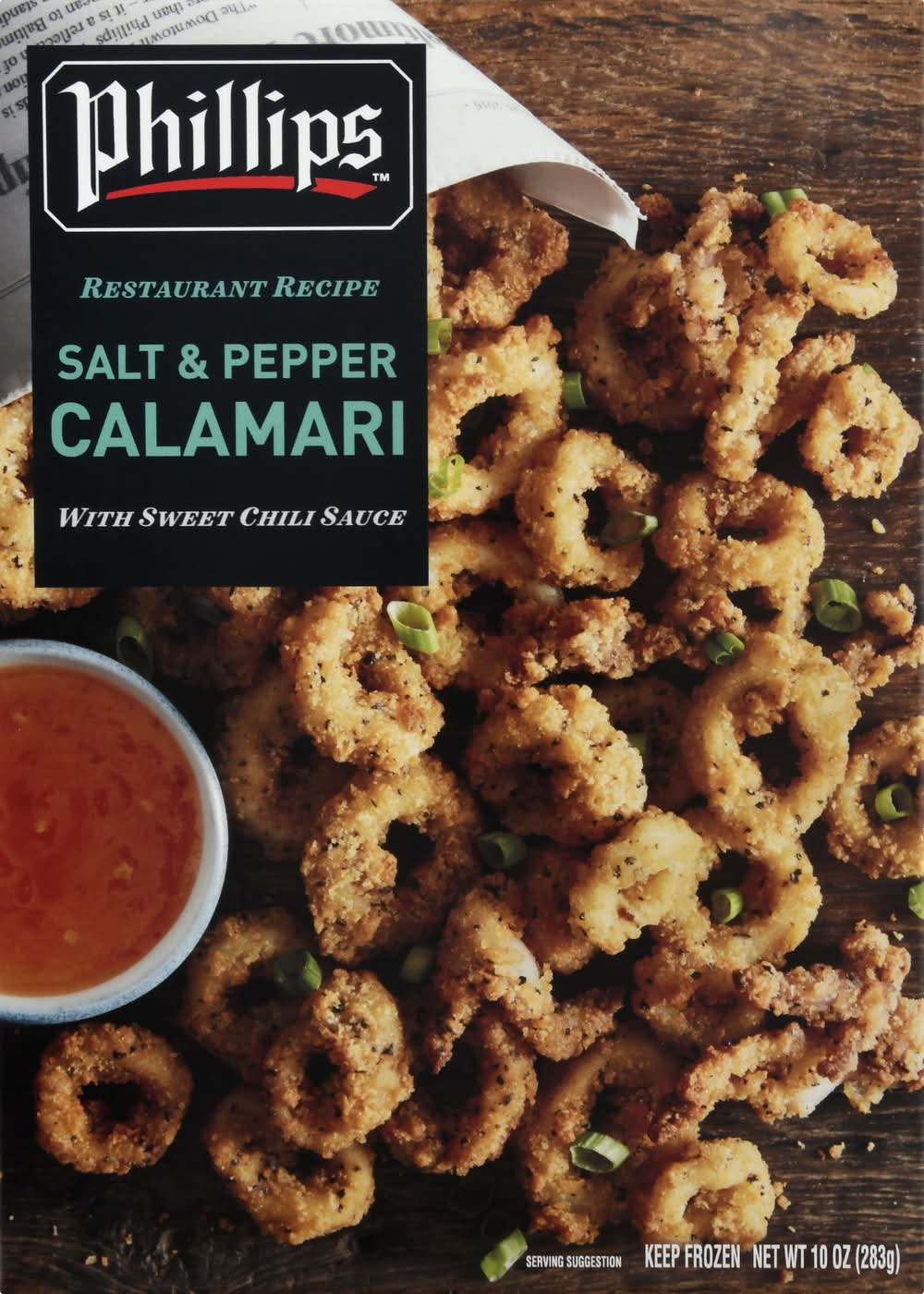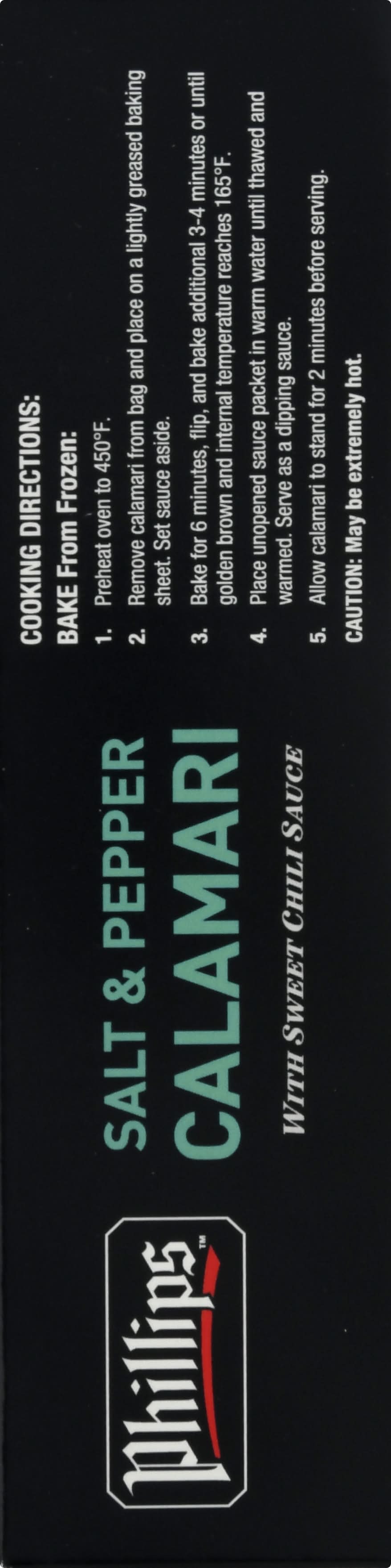 One of the most popular appetizers in Phillips Seafood Restaurants, our Salt & Pepper Calamari can now be baked at home without sacrificing flavor or texture! Tender calamari is seasoned with salt and pepper and lightly dusted with a specially formulated oven-ready breading. A sweet and spicy chili sauce is included for dipping. Ready from the oven in just 10 minutes, Phillips Salt & Pepper Calamari is a quick and easy appetizer or meal for one. • Flavor: Salt & pepper • Number of servings: 2 • Philips Food, Baltimore, MD, 21227, Ph: 888-234-CRAB • Packaging: Reusable