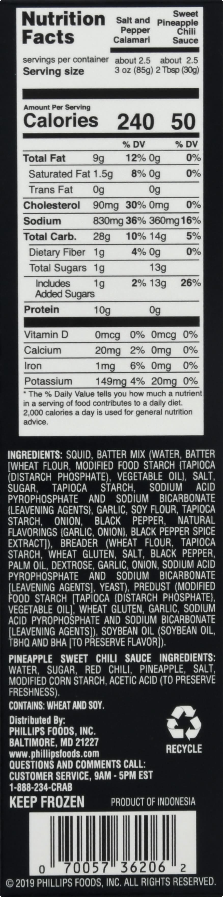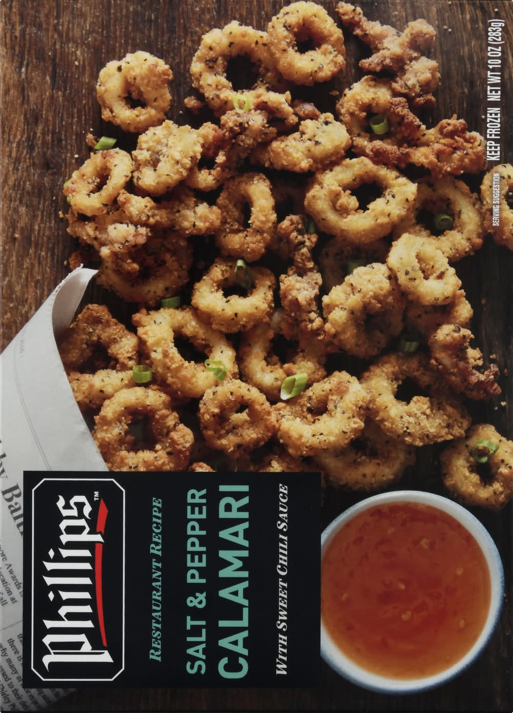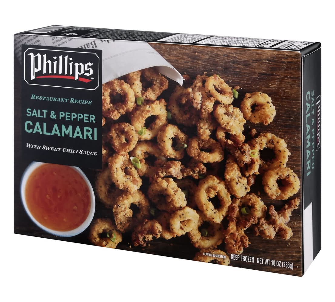 One of the most popular appetizers in Phillips Seafood Restaurants, our Salt & Pepper Calamari can now be baked at home without sacrificing flavor or texture! Tender calamari is seasoned with salt and pepper and lightly dusted with a specially formulated oven-ready breading. A sweet and spicy chili sauce is included for dipping. Ready from the oven in just 10 minutes, Phillips Salt & Pepper Calamari is a quick and easy appetizer or meal for one. • Flavor: Salt & pepper • Number of servings: 2 • Philips Food, Baltimore, MD, 21227, Ph: 888-234-CRAB • Packaging: Reusable