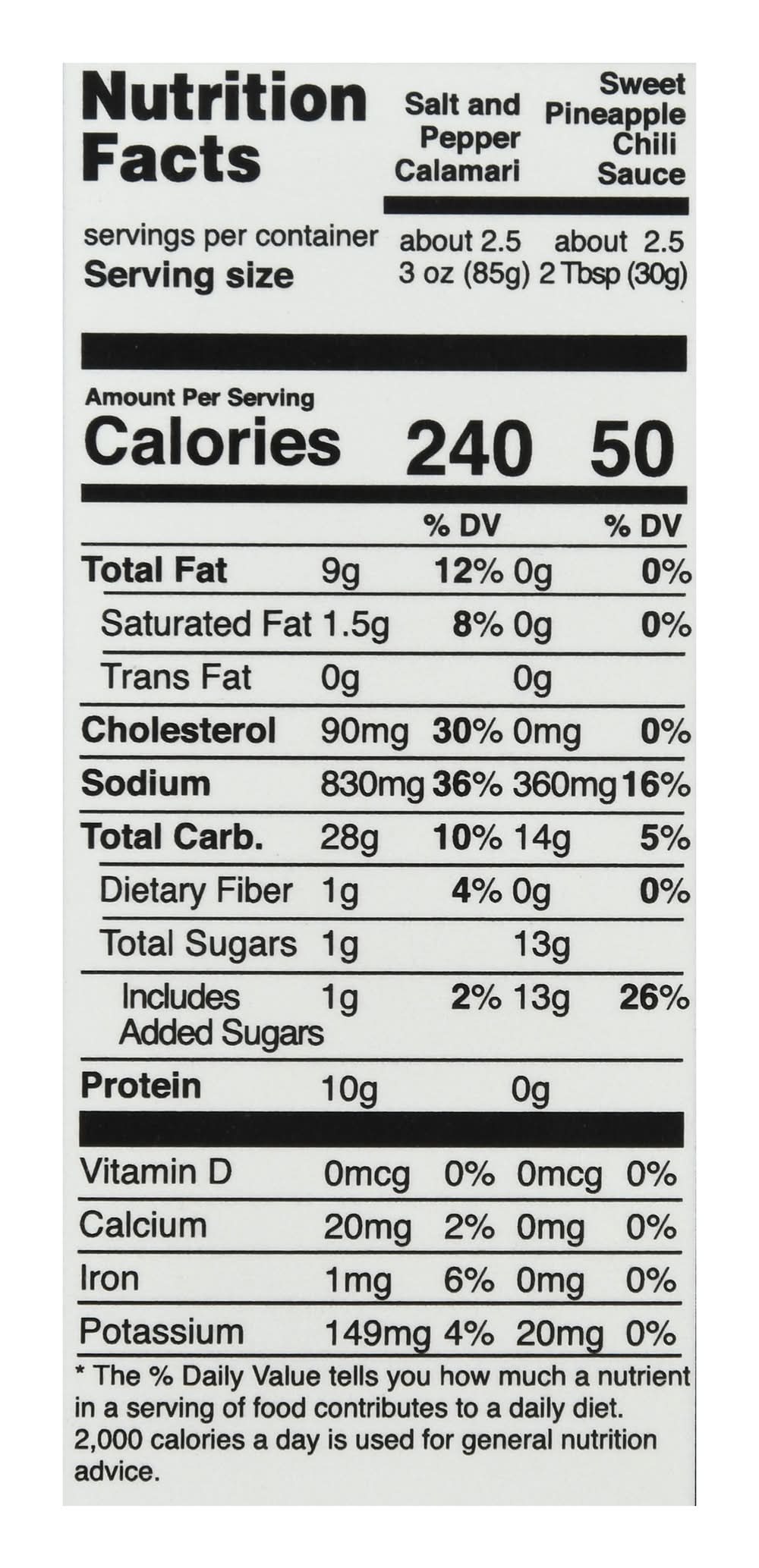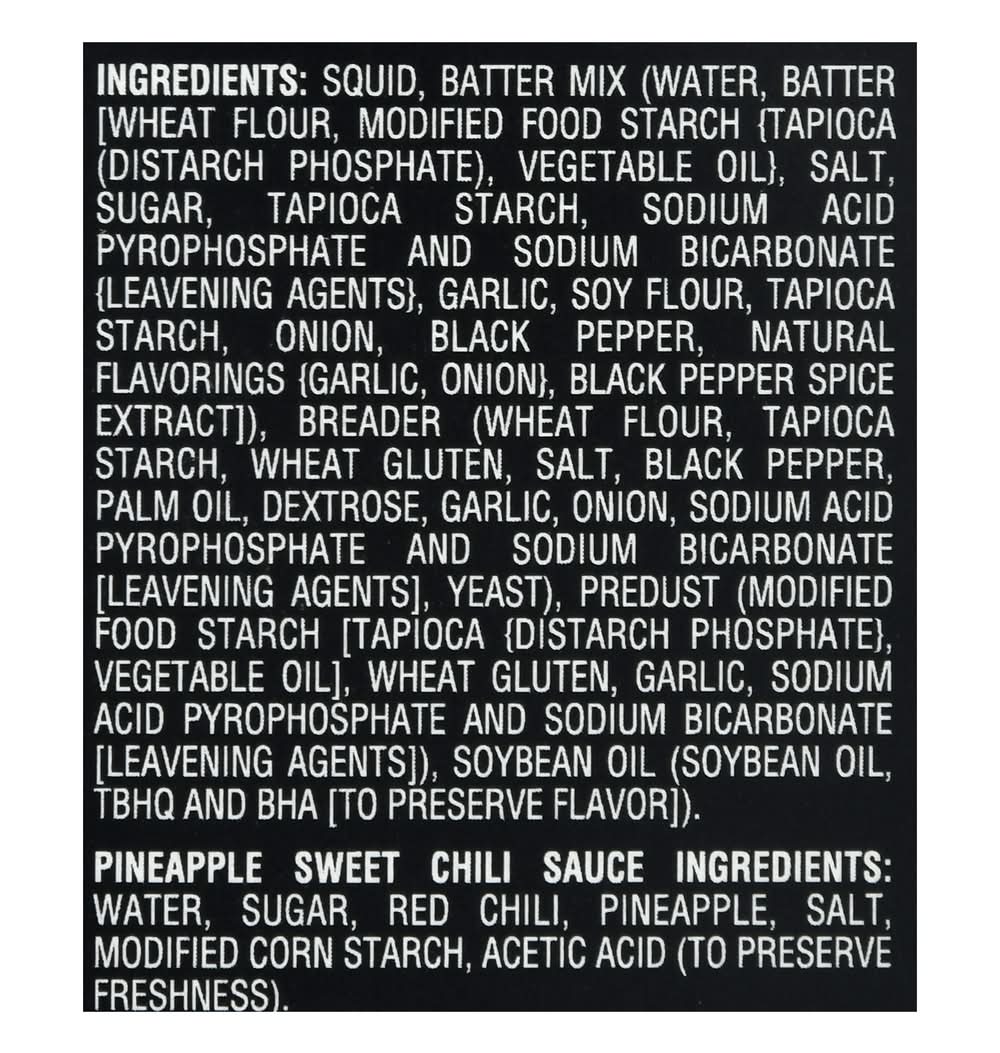 Ingredients: Squid, Batter Mix (Water Batter [Wheat Flour Modified Food Starch {Tapioca (Distarch Phosphate), Vegetable Oil}, Salt, Sugar, Tapioca Starch, Sodium Acid Pyrophosphate and Sodium Bicarbonate {Leavening Agents}, Garlic, Soy Flour, Tapioca Starch, Onion, Black Pepper, Natural Flavorings {Garlic, Onion}, Black Pepper Spice Extract]), Breader (Wheat Flour Tapioca Starch Wheat Gluten Salt Black Pepper Palm Oil Dextrose Garlic Onion Sodium Acid Pyrophosphate and Sodium Bicarbonate [Leavening Agents] Yeast), Predust (Modified Food Starch [Tapioca {Distarch Phosphate} Vegetable Oil] Wheat Gluten Garlic Sodium Acid Pyrophosphate and Sodium Bicarbonate [Leavening Agents]), Soybean Oil (Soybean Oil TBHQ and BHA [to Preserve Flavor]). Pineapple Sweet Chili Sauce Ingredients: Water, Sugar, Red Chili, Pineapple, Salt, Modified Corn Starch, Acetic Acid (to Preserve Freshness) Contains: Wheat, Soybeans, Gluten