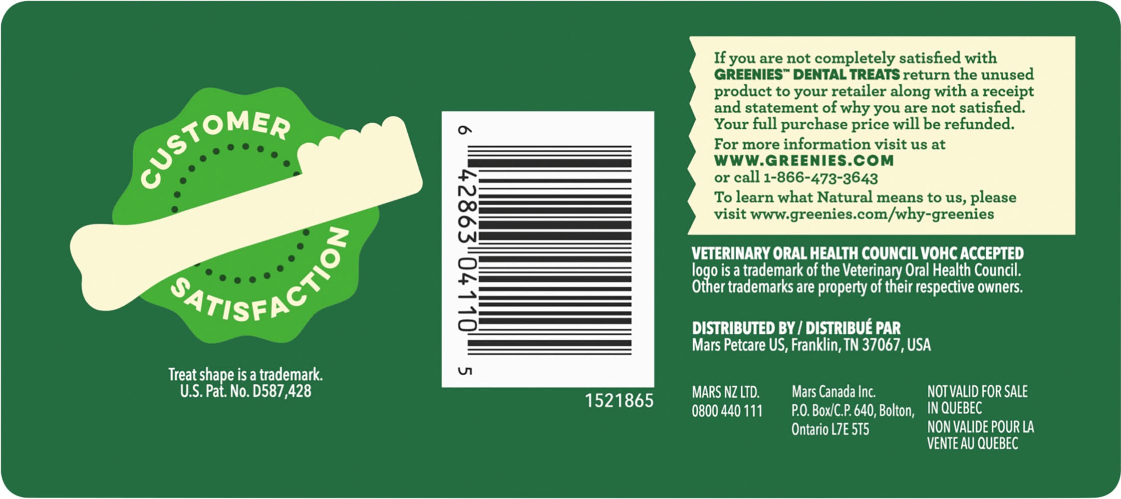 Once a day for incredible happiness: feeding guidelines: feed 1 greenies dental treat per day. for dogs 50 - 100 lbs. not suitable for dogs less than 5 lbs. or dogs less than 6 months of age. fresh drinking water should always be available. attention: as with any edible product, monitor your dog to ensure the treat is adequately chewed. gulping any item can be harmful or even fatal to a dog. for each greenies dental treat fed, reduce your dog's main meal by 139 kcals.