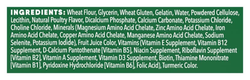 Ingredients: Wheat Flour, Glycerin, Wheat Gluten, Gelatin, Water, Powdered Cellulose, Lecithin, Natural Poultry Flavor, Dicalcium Phosphate, Calcium Carbonate, Potassium Chloride, Choline Chloride, Minerals (Magnesium Amino Acid Chelate, Zinc Amino Acid Chelate, Iron Amino Acid Chelate, Copper Amino Acid Chelate, Manganese Amino Acid Chelate, Sodium Selenite, Potassium Iodide), Fruit Juice Color, Vitamins (Vitamin E Supplement, Vitamin B12 Supplement, D-Calcium Pantothenate [Vitamin B5], Niacin Supplement, Riboflavin Supplement [Vitamin B2], Vitamin A Supplement, Vitamin D3 Supplement, Biotin, Thiamine Mononitrate [Vitamin B1], Pyridoxine Hydrochloride [Vitamin B6], Folic Acid), Turmeric Color Contains: Wheat, Gluten