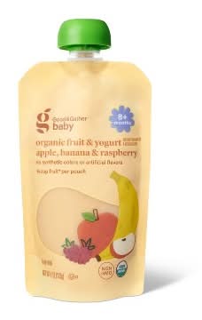 Little ones who are starting to pick up foods on their own will love the fruity flavor of this Organic Apple, Banana, Raspberry Yogurt Baby Food Pouch from Good & Gather. Made with organic yogurt, apple, banana and raspberry, this baby food pouch includes about 3/4 cup of fruit per 4-ounce pouch, with 25% your baby's daily value of potassium. Plus, this delicious yogurt snack for babies is made with no artificial colors or artificial flavors. These food pouches are recommended for ages 8 months and up. 8+ months: Your baby may be ready for this food when they: • Crawl with tummy off the floor. • Begin to mash food between gums using jaws. • Start to bite into foods. • Begin to pick up food to eat with fingers. • Have tried a variety of foods. Every product that carries the Good & Gather name starts with quality ingredients that deliver great taste, making it easier for you and your family to eat well every day. We promise you’ll love each bite or your money back. • Flavor: Apple- banana- raspberry • Size: 8 M+