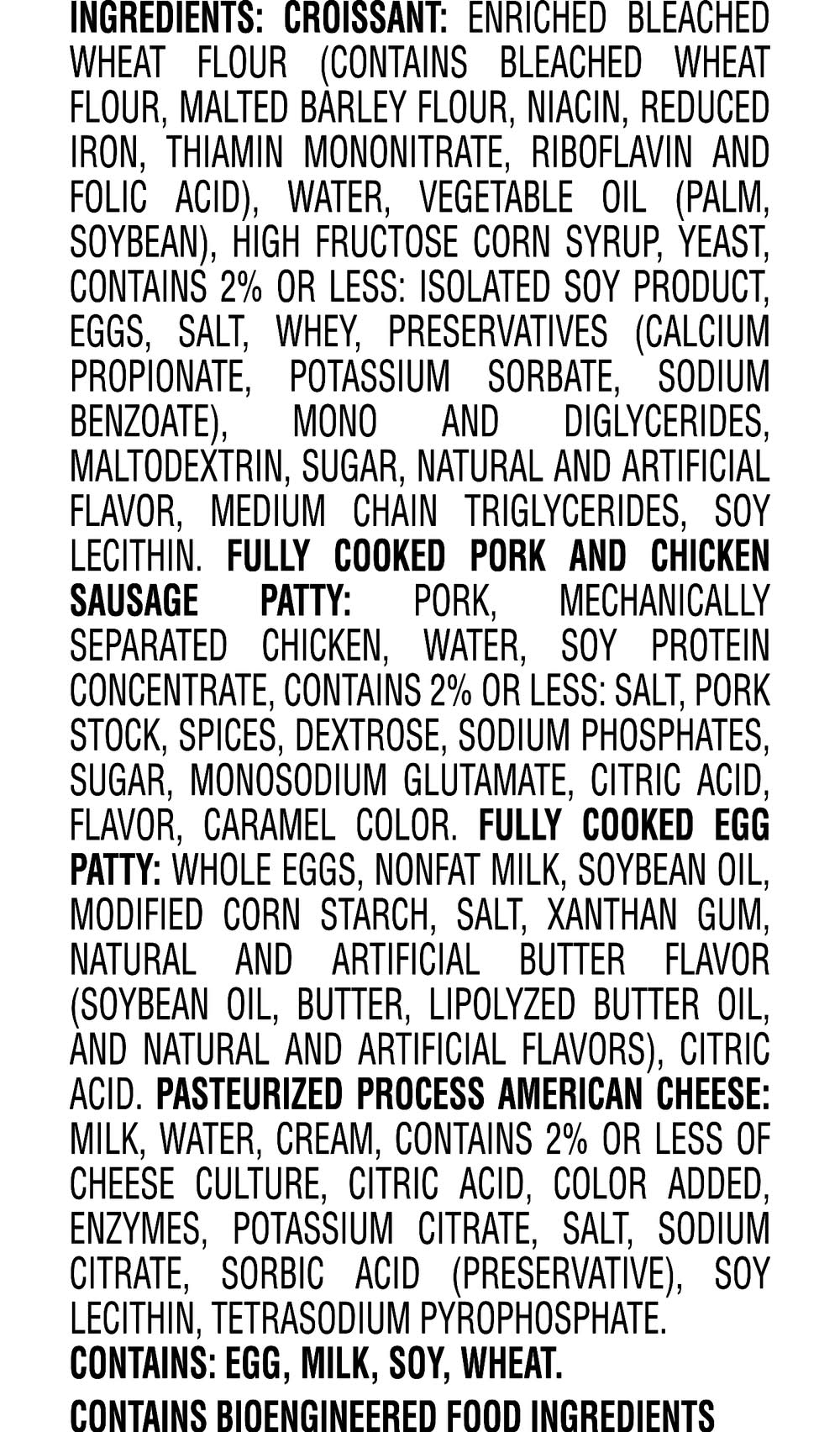 Ingredients: Croissant: Enriched Bleached Wheat Flour (Contains Bleached Wheat Flour, Malted Barley Flour, Niacin, Reduced Iron, Thiamin Mononitrate, Riboflavin And Folic Acid), Water, Vegetable Oil (Palm, Soybean), High Fructose Corn Syrup, Yeast, Contains 2% Or Less: Isolated Soy Product, Eggs, Salt, Whey, Preservatives (Calcium Propionate, Potassium Sorbate, Sodium Benzoate), Mono And Diglycerides, Maltodextrin, Sugar, Natural And Artificial Flavor, Medium Chain Triglycerides, Soy Lecithin. Fully Cooked Pork And Chicken Sausage Patty: Pork, Mechanically Separated Chicken, Water, Soy Protein Concentrate, Contains 2% Or Less: Salt, Pork Stock, Spices, Dextrose, Sodium Phosphates, Sugar, Monosodium Glutamate, Citric Acid, Flavor, Caramel Color. Fully Cooked Egg Patty: Whole Eggs, Nonfat Milk, Soybean Oil, Modified Corn Starch, Salt, Xanthan Gum, Natural And Artificial Butter Flavor (Soybean Oil, Butter, Lipolyzed Butter Oil, And Natural And Artificial Flavors), Citric Acid. Pasteurized Process American Cheese: Milk, Water, Cream, Contains 2% Or Less Of Cheese Culture, Citric Acid, Color Added, Enzymes, Potassium Citrate, Salt, Sodium Citrate, Sorbic Acid (Preservative), Soy Lecithin, Tetrasodium Pyrophosphate. Contains: Eggs, Milk, Soy, Wheat