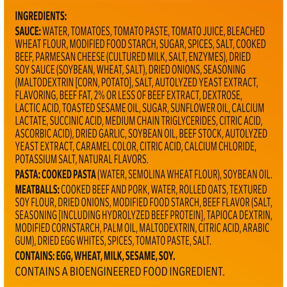 Ingredients: SAUCE: WATER, TOMATOES, TOMATO PASTE, TOMATO JUICE, BLEACHED WHEAT FLOUR, MODIFIED FOOD STARCH, SUGAR, SPICES, SALT, COOKED BEEF, PARMESAN CHEESE (CULTURED MILK, SALT, ENZYMES), DRIED SOY SAUCE (SOYBEAN, WHEAT, SALT), DRIED ONIONS, SEASONING (MALTODEXTRIN [CORN, POTATO], SALT, AUTOLYZED YEAST EXTRACT, FLAVORING, BEEF FAT, 2% OR LESS OF BEEF EXTRACT, DEXTROSE, LACTIC ACID, TOASTED SESAME OIL, SUGAR, SUNFLOWER OIL, CALCIUM LACTATE, SUCCINIC ACID, MEDIUM CHAIN TRIGLYCERIDES, CITRIC ACID, ASCORBIC ACID), DRIED GARLIC, SOYBEAN OIL, BEEF STOCK, AUTOLYZED YEAST EXTRACT, CARAMEL COLOR, CITRIC ACID, CALCIUM CHLORIDE, POTASSIUM SALT, NATURAL FLAVORS. PASTA: COOKED PASTA (WATER, SEMOLINA WHEAT FLOUR), SOYBEAN OIL MEATBALLS: COOKED BEEF AND PORK, WATER, ROLLED OATS, TEXTURED SOY FLOUR, DRIED ONIONS, MODIFIED FOOD STARCH, BEEF FLAVOR (SALT, SEASONING [INCLUDING HYDROLYZED BEEF PROTEIN], TAPIOCA DEXTRIN, MODIFIED CORNSTARCH, PALM OIL, MALTODEXTRIN, CITRIC ACID, ARABIC GUM), DRIED EGG WHITES, SPICES, TOMATO PASTE, SALT. Contains: CONTAINS: EGG, WHEAT, MILK, SESAME, SOY.