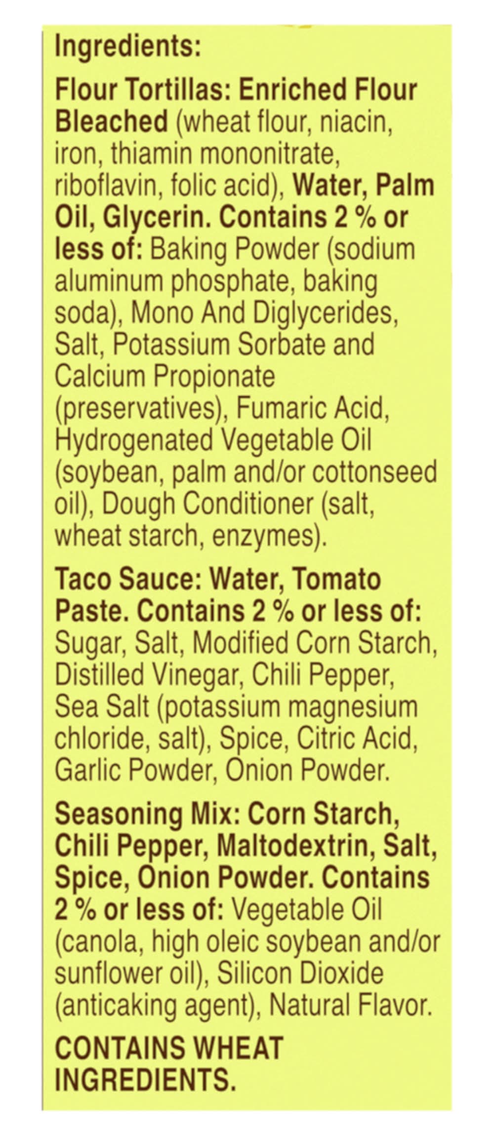 Ingredients: Flour Tortillas: Enriched Flour Bleached (Wheat Flour, Niacin, Iron, Thiamin Mononitrate, Riboflavin, Folic Acid), Water, Palm Oil, Glycerin, Contains 2% or Less of: Baking Powder (Sodium Aluminum Phosphate, Baking Soda), Mono and Diglycerides, Salt, Potassium Sorbate and Calcium Propionate (Preservatives), Fumaric Acid, Hydrogenated Vegetable Oil (Soybean, Palm and/or Cottonseed Oil), Dough Conditioner (Salt, Wheat Starch, Enzymes), Taco Sauce: Water, Tomato Paste, Contains 2% or Less of: Sugar, Salt, Modified Corn Starch, Distilled Vinegar, Chili Pepper, Sea Salt (Potassium Magnesium Chloride, Salt), Spice, Citric Acid, Garlic Powder, Onion Powder, Seasoning Mix: Corn Starch, Chili Pepper, Maltodextrin, Salt, Spice, Onion Powder, Contains 2% or Less of: Vegetable Oil (Canola, High Oleic Soybean and/or Sunflower Oil), Silicon Dioxide Anticaking Agent), Natural Flavor Contains: Wheat, Soybeans