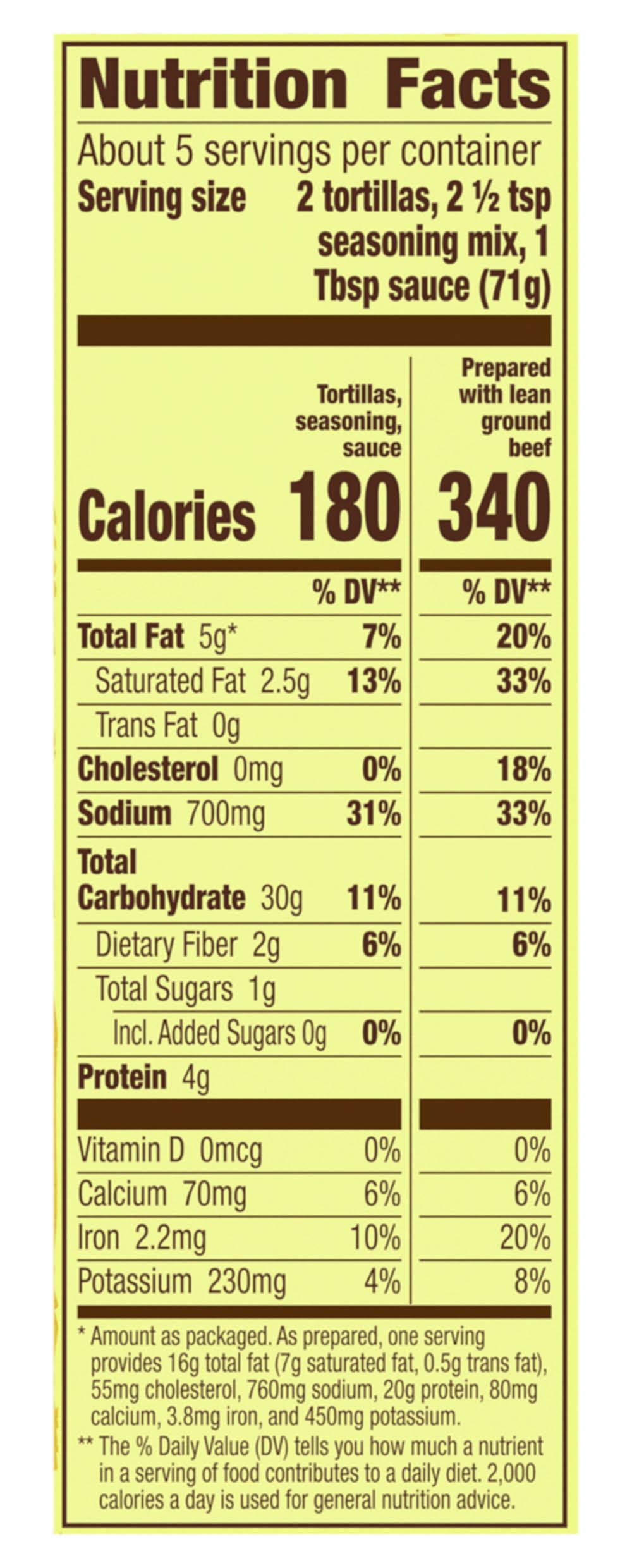 Take the trouble out of taco night with Old El Paso Soft Taco Dinner Kits. You get 10 Old El Paso flour tortillas, taco seasoning and taco sauce all in one box, so your tacos can be ready in about 20 minutes. Simply add your favorite fillings and toppings to create an easy and delicious fiesta any night of the week. Tonight, we taco! For more than 80 years, Old El Paso has been bringing families and communities together to celebrate old and new traditions around delicious, Mexican-inspired flavors. We believe that any night can be a taco night, and we’re here to help make it a little easier and a lot more delicious. Our variety of crispy hard taco shells, tasty soft tortillas, flavorful seasonings, and much more help make taco night fun. • General Mills Sales, Inc., Minneapolis, MN, 55440 • Packaging: Reusable