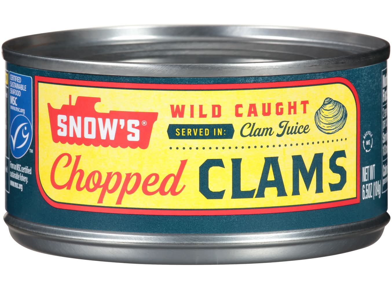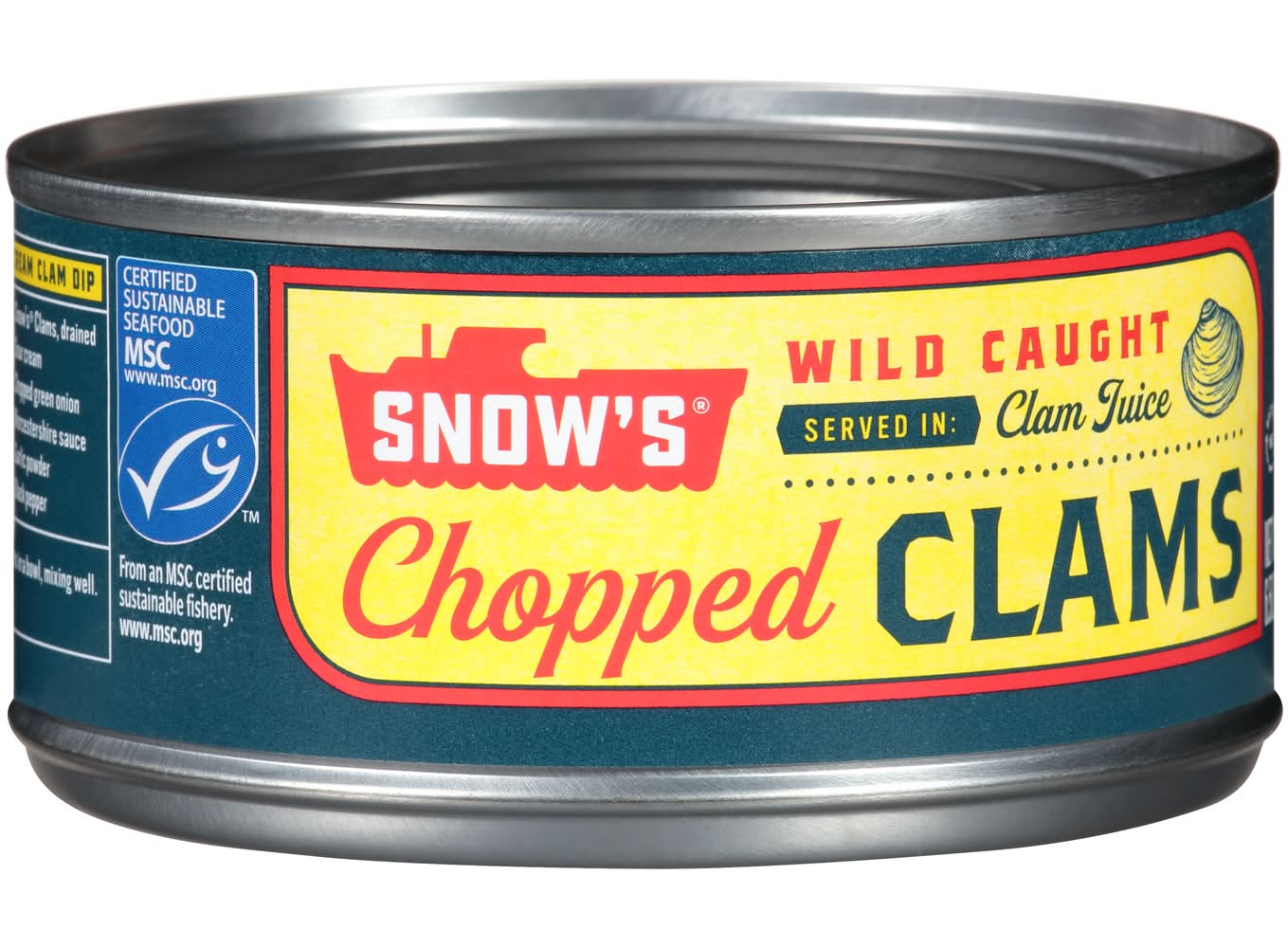 Served in: clam juice. snow's wild caught chopped clams in clam juice, are perfect for chowders, soups, sauces, or any seafood recipe.