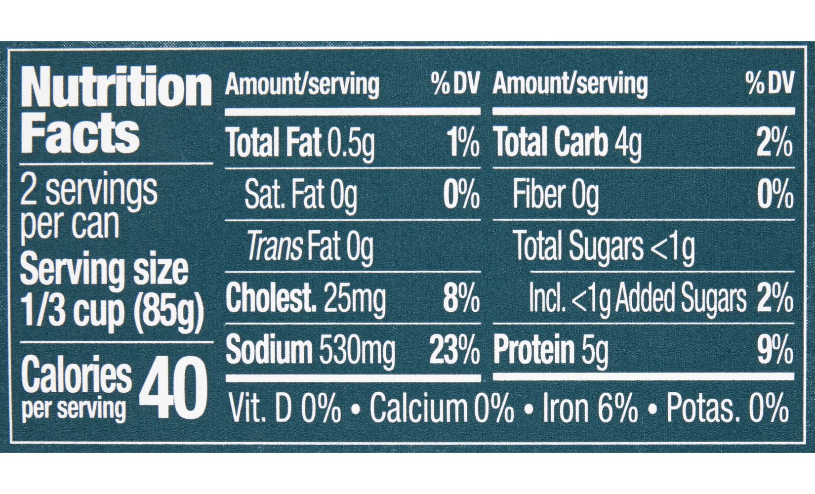 Ingredients: Clams in Clam Juice, Water, Salt, Sugar, Sodium Tripolyphosphate (to Retain Natural Juices), Calcium Disodium EDTA (to Protect Color)