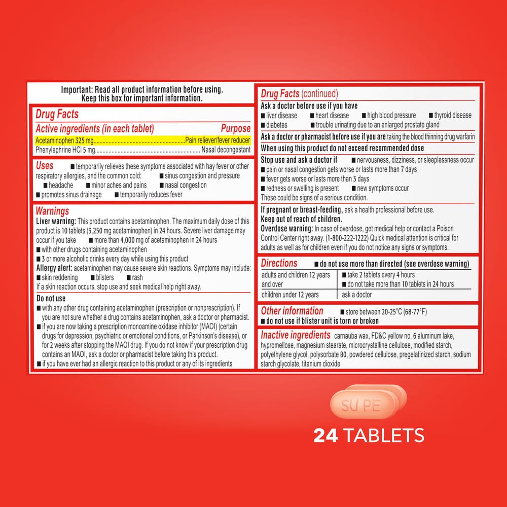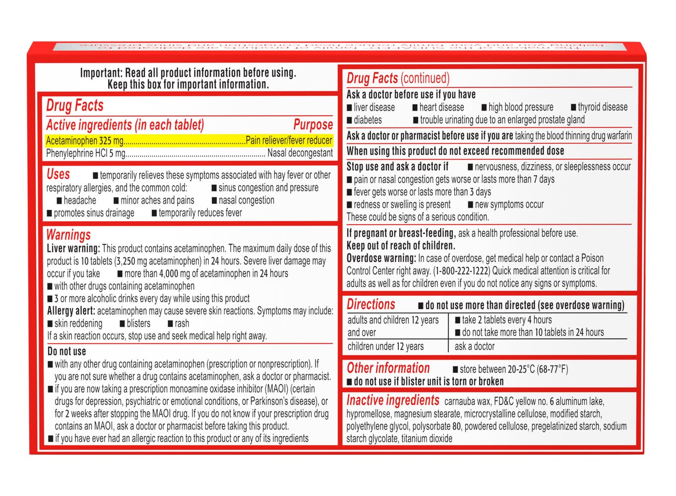 Ingredients: Active Ingredients (in each caplet): Acetaminophen 325 mg (Pain-reliever/ Fever reducer) Phenylephrine HCl 5 mg (Nasal decongestant) Inactive Ingredients: Carnauba wax, corn starch, FDC yellow no. 6 aluminum lake, hypromellose, magnesium stearate, microcrystalline cellulose, polyethylene glycol, polysorbate 80, powdered cellulose, pregelatinized starch, sodium starch glycolate, titanium dioxide Additives: Inactive Ingredients: Carnauba Wax, FD&C Yellow 6 Aluminum Lake, Hypromellose, Magnesium Stearate, Microcrystalline Cellulose, Modified Starch, Polyethylene Glycol, Polysorbate 80, Powdered Cellulose, Pregelatinized Starch, Sodium Starch Glycolate, Titanium Dioxide.