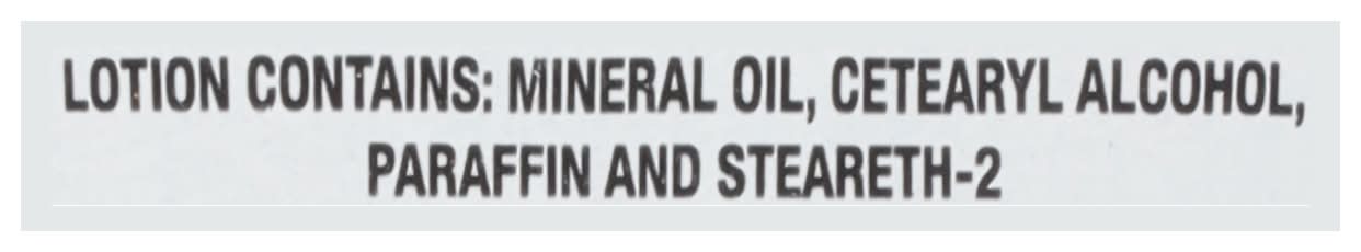 Ingredients: Lotion Contains: Mineral Oil, Cetearyl Alcohol, Paraffin and Steareth-2