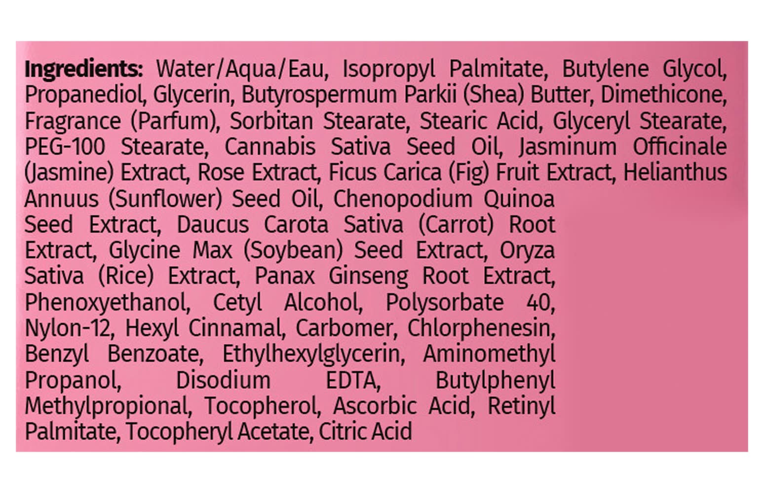 Ingredients: Water/Aqua/Eau, Isopropyl Palmitate, Butylene Glycol, Propanediol, Glycerin, Butyrospermum Parkii (Shea) Butter, Dimethicone, Fragrance (Parfum), Sorbitan Stearate, Stearic Acid, Glyceryl Stearate, PEG-100 Stearate, Cannabis Sativa Seed Oil, Jasminum Officinale (Jasmine) Extract, Rose Extract, Ficus Carica (Fig) Fruit Extract, Helianthus Annuus (Sunflower) Seed Oil, Chenopodium Quinoa Seed Extract, Daucus Carota Sativa (Carrot) Root Extract, Glycine Max (Soybean) Seed Extract, Oryza Sativa (Rice) Extract, Panax Ginseng Root Extract, Phenoxyethanol, Cetyl Alcohol, Polysorbate 40, Nylon-12, Hexyl Cinnamal, Carbomer, Chlorphenesin, Benzyl Benzoate, Ethylhexylglycerin, Aminomethyl Propanol, Disodium EDTA, Butylphenyl Methylpropional, Tocopherol, Ascorbic Acid, Retinyl Palmitate, Tocopheryl Acetate, Citric Acid