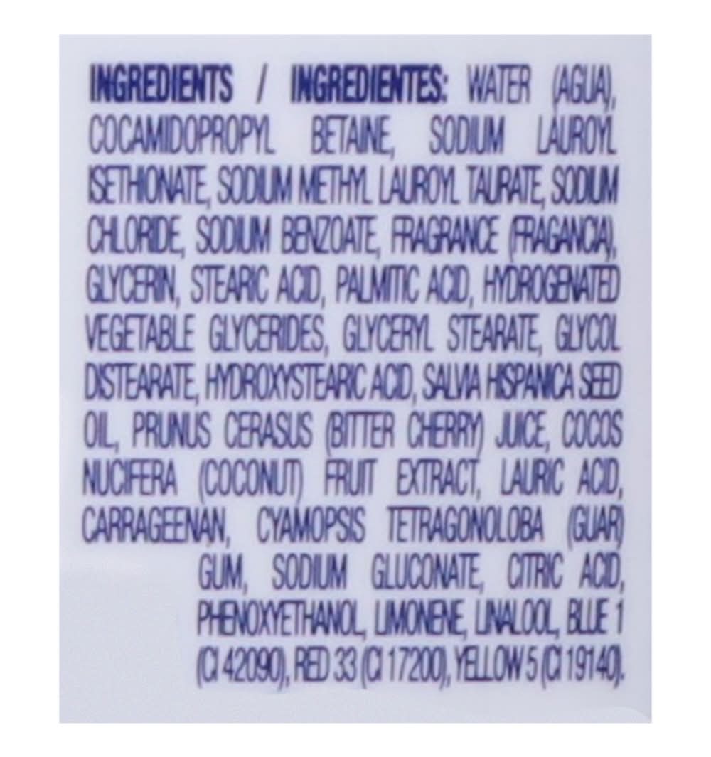 Ingredients: Water, Cocamidopropyl Betaine, Sodium Lauroyl Isethionate, Sodium Methyl Lauroyl Taurate, Sodium Chloride, Sodium Benzoate, Fragrance, Glycerin, Stearic Acid, Palmitic Acid, Hydrogenated Vegetable Glycerides, Glyceryl Stearate, Glycol Distearate, Hydroxystearic Acid, Salva Hispanica Seed Oil, Prunus Cerasus (Bitter Cherry) Juice, Cocos Nucifera (Coconut) Fruit Extract, Lauric Acid, Carrageenan, Cyamopsis Tetragonoloba (Guar) Gum, Sodium Gluconate, Citric Acid, Phenoxyethanol, Limonene, Linalool, Blue 1 (CI 42090), Red 33 (CI 17200), Yellow 5 (CI 19140) Contains: Tree Nuts, Coconuts