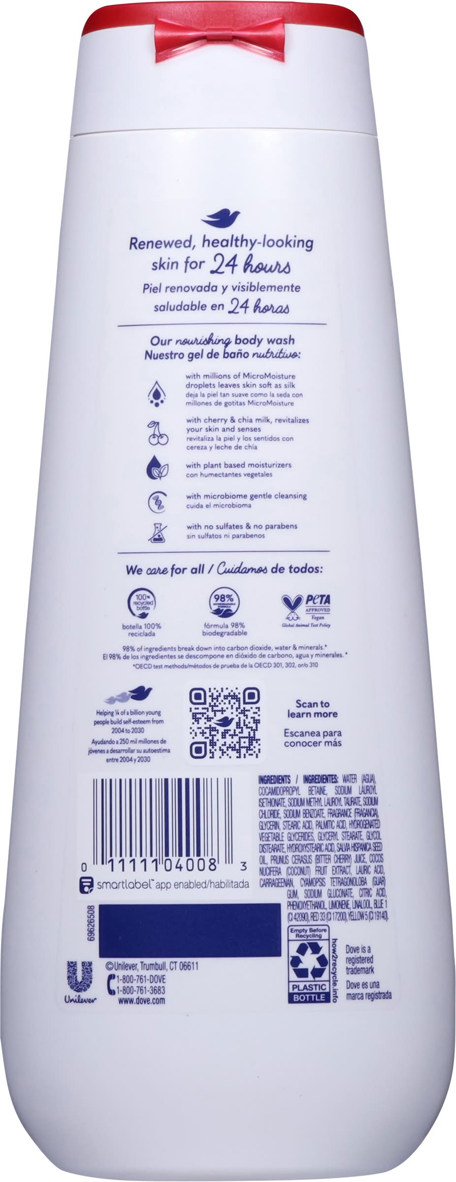 Go ahead and treat yourself. Not us encouraging you to indulge in some sumptuous skincare every day. But while we’re at it, meet our Dove Revitalizing Cherry & Chia Milk Body Wash. This light gel formula will take your shower routine to a new level and deliver cleansed, nourished, revitalized skin. And the cherry on top? It’ll stay that way all day thanks to millions of 24hr Renewing MicroMoisture™️droplets, skin-natural nourishers and skin-loving plant-based moisturizers that are specifically designed to absorb deeply and work with your skin’s natural renewal process to help retain and boost moisture. Revitalized, renewed, and ready for more. Bonus (literal) cherry on top: Indulge your senses with this luscious wild cherry scent bursting with red fruits and creamy warm chia that makes this an addictive addition to your shower routine. To use this light gel formula, squeeze into palms or loofah, massage into skin, take it all in, let the lather soak in, rinse and step out of shower feeling revitalized and silky-smooth all over. Who else would you trust, but the #1 dermatologist-recommended brand (us!) to deliver a long-lasting, hydrating body wash? Our Revitalizing Cherry & Chia Milk Body Wash is vegan and Dove is PETA approved, meaning we do not test on animals anywhere in the world. Plus, it’s sulfate-free, paraben-free, and packaged in 100% recycled bottles. Packaging: Reusable