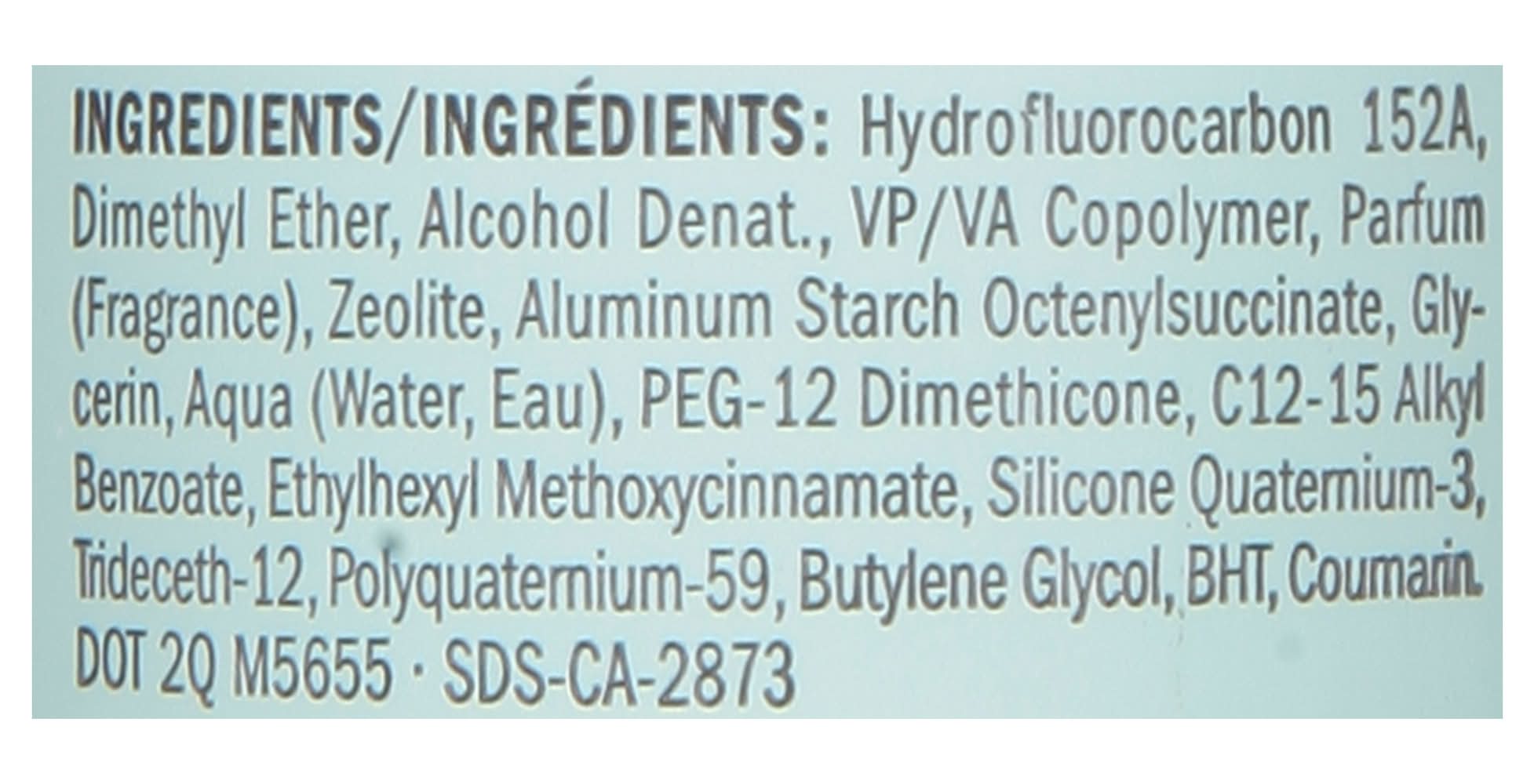 Ingredients: Hydrofluorocarbon 152a, Dimethyl Ether, Alcohol Denat, VP/VA Copolymer, Parfum (Fragrance), Zeolite, Aluminum Starch Octenylsuccinate, Glycerin, Aqua (Water, Eau), PEG-12 Dimethicone, C12-15 Alkyl Benzoate, Ethylhexyl Methoxycinnamate, Silicon Quaternium-3, Trideceth-12, Polyquaternium-59, Butylene Glycol, BHT, Coumarin