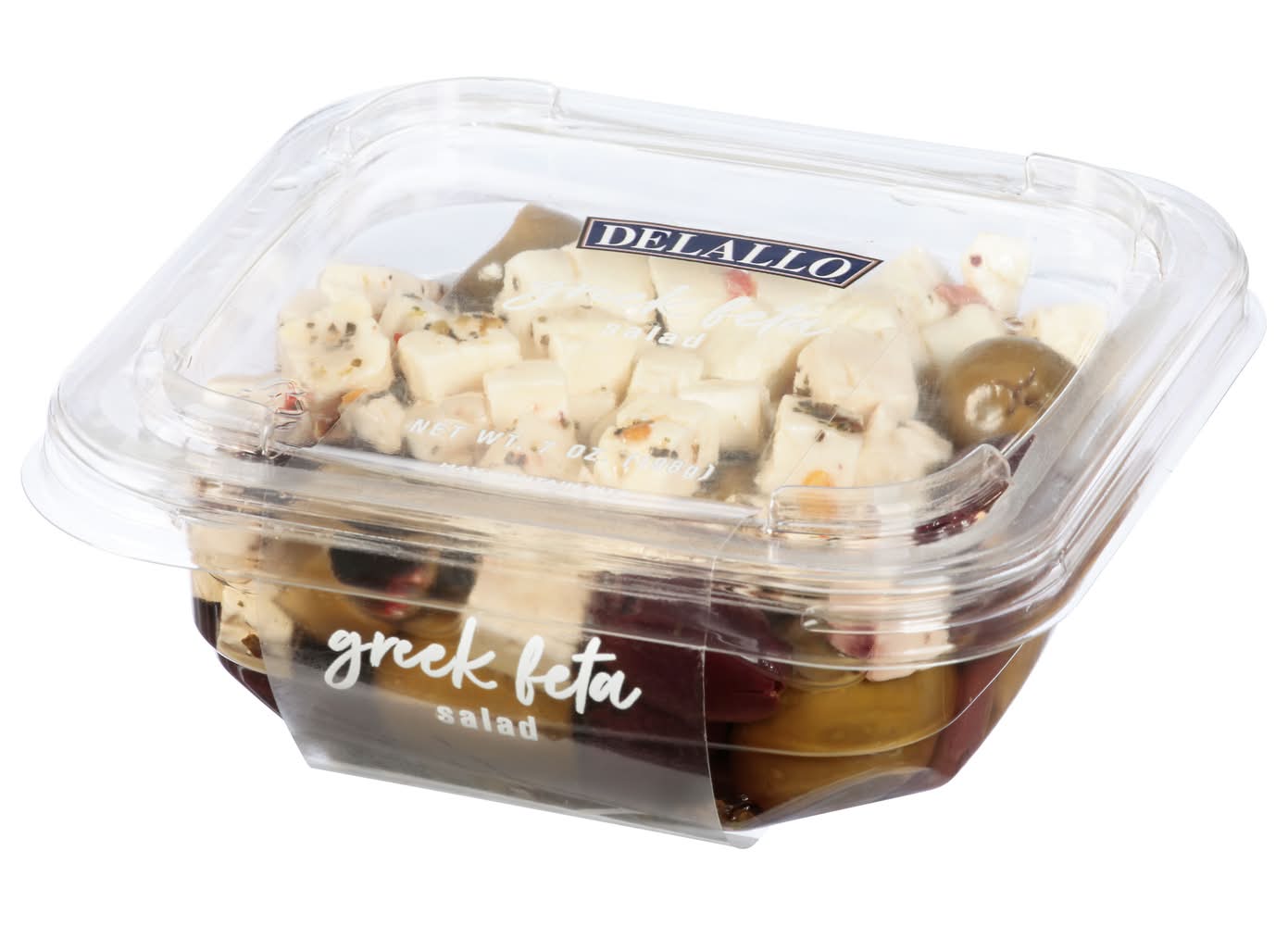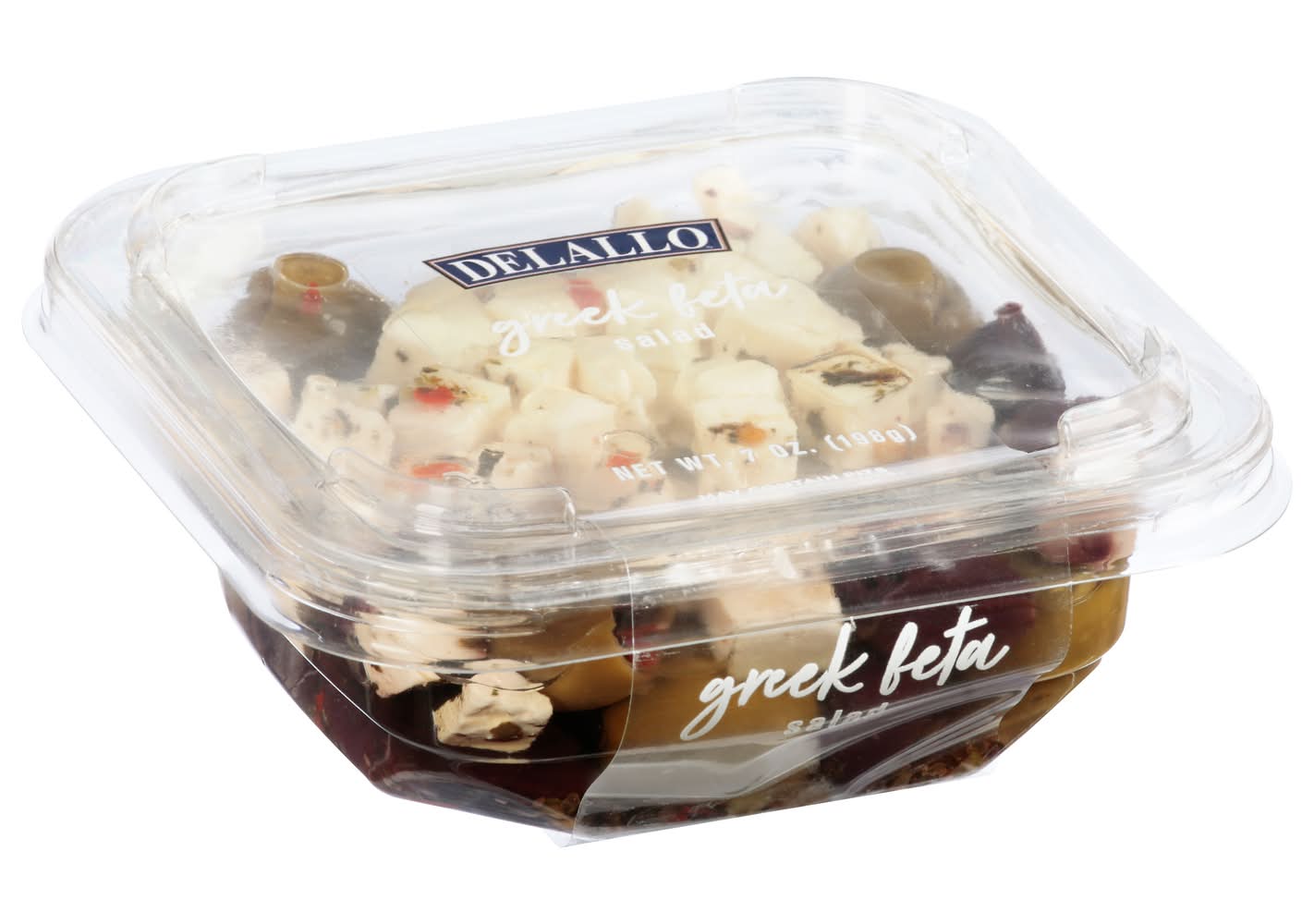 DeLallo Greek Feta Salad is a colorful antipasto that combines smoky purple kalamata olives, a mix of green and black olives, and creamy cubes of briny feta cheese. Everything is marinated in a savory blend of Greek herbs and oil, creating a bold, well-rounded flavor. This olive mix is pitted, naturally cured and ready-to-eat, making this a perfect gourmet snack to enjoy straight from the resealable container. Stunning as a stand-alone antipasto or easily add it to cheese boards, charcuterie spreads, and other antipasto platters. This greek salad also makes everyday meals feel special. Add them to leafy green salads, pasta salads, pizzas, flatbreads, and wraps, or spoon over hummus and Mediterranean dips. DeLallo’s Greek Feta Salad is the effortless way to bring Greek-inspired flavor to snacks, meals, and entertaining. Pitted olives may still contain pits or pit fragments. George Delallo Co. Inc., Jeannette , PA , 15644
