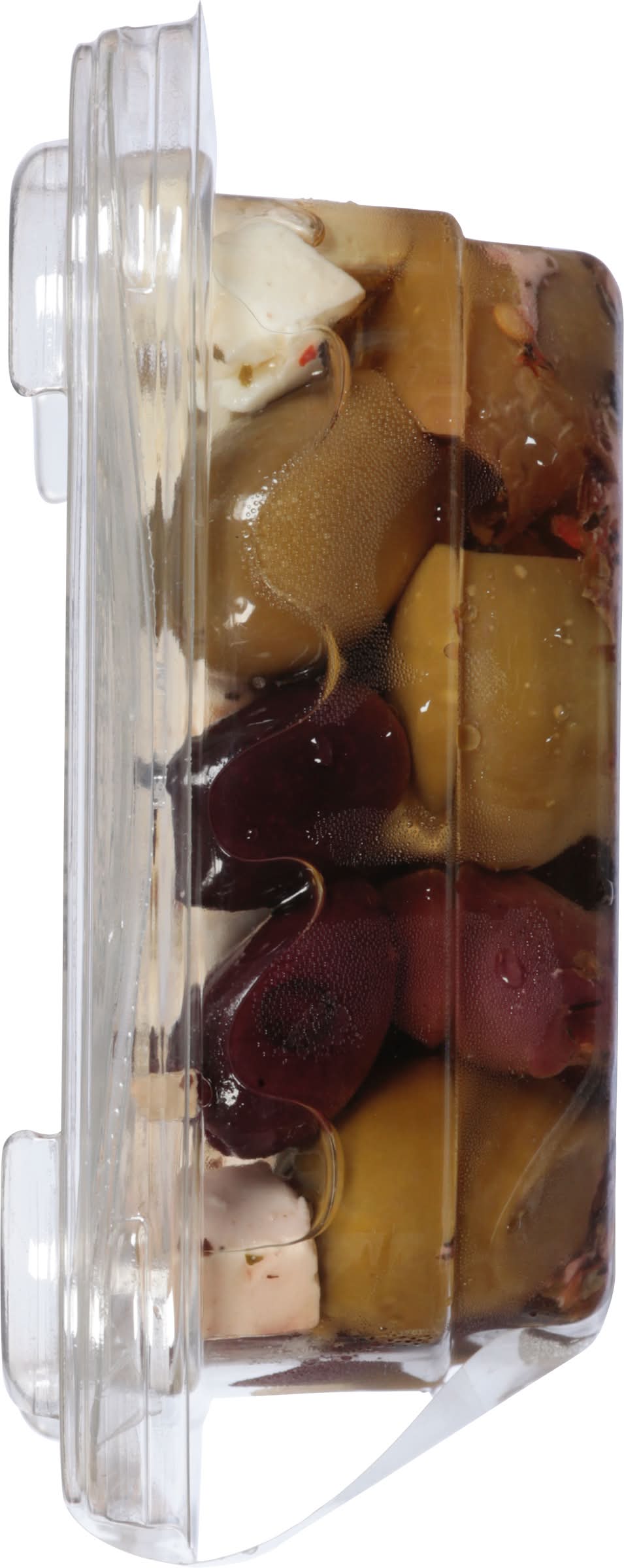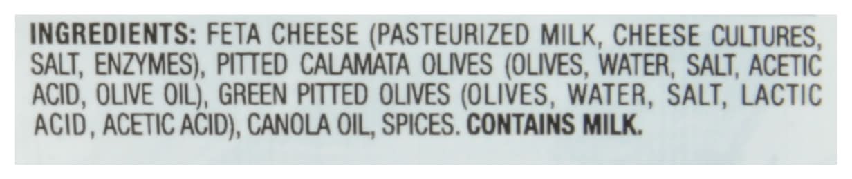 Ingredients: Feta Cheese (Pasteurized Milk, Cheese Cultures, Salt, Enzymes), Pitted Calamata, Olives (Olives, Water, Salt, Acetic Acid, Olive Oil), Green Pitted Olives (Olives, Water, Salt, Lactic Acid, Acetic Acid), Canola Oil, Spices. Contains: Milk
