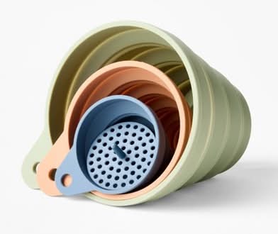 Transfer and store ingredients with minimal mess using the Silicone Collapsible Funnel Set from Figmint. Made of silicone, this collapsible funnel set includes three funnels in different sizes and one strainer. They're designed in various solid colors for an appealing look, and are perfect for refilling bottles, containers and more. Plus, they're dishwasher safe for convenient cleanup after use.