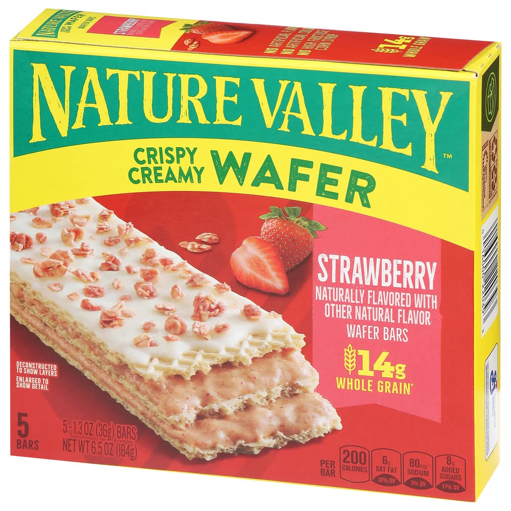 Indulge your crispy, creamy cravings with delicious Nature Valley Strawberry Wafer Bars. These snack bars are made with light and crispy whole grain wafers, layers of strawberry flavored filling, and a sweet topping with crunchy granola. Each serving contains 14g of whole grains (at least 48g recommended daily). These individually wrapped snack bars contain no artificial flavors, no artificial colors, and no high fructose corn syrup. Reach for these delectable strawberry wafer bars for a satisfying snack during an afternoon break. Make them your go-to for easy lunch box treats or after school snacks. Or take a box along to share with the family when conquering a new trail. Whether you're heading off the beaten path or into your own backyard, our wafer bars make an ideal choice wherever you are. At Nature Valley, we believe that what you put in is what you get out. So wherever the moment takes you and your family, you can rely on our great-tasting snacks to help keep you going. Contains one regular cardboard box of Nature Valley Wafer Bars, Strawberry, 5 Bars, 6.5 oz Box; perfect for instant snacking. • Flavor: Strawberry • Pack size: 5 • Packaging: Reusable