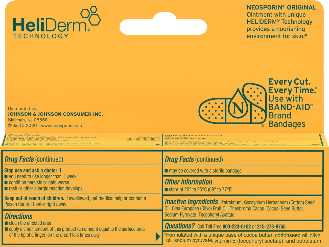 First aid antibiotic ointment. Bacitracin zinc - Neomycin sulfate - Polymyxin B sulfate. No. 1 doctor recommended brand. Triple antibiotic ointment. 24-hour infection protection. Effective germ kill formula. Neosporin original ointment with unique Heliderm technology provides a nourishing environment for skin. Every cut every time. Use with band -aid brand bandages. • Johnson & johnson consumer inc., Skillman, NJ 08558 • Packaging: Reusable