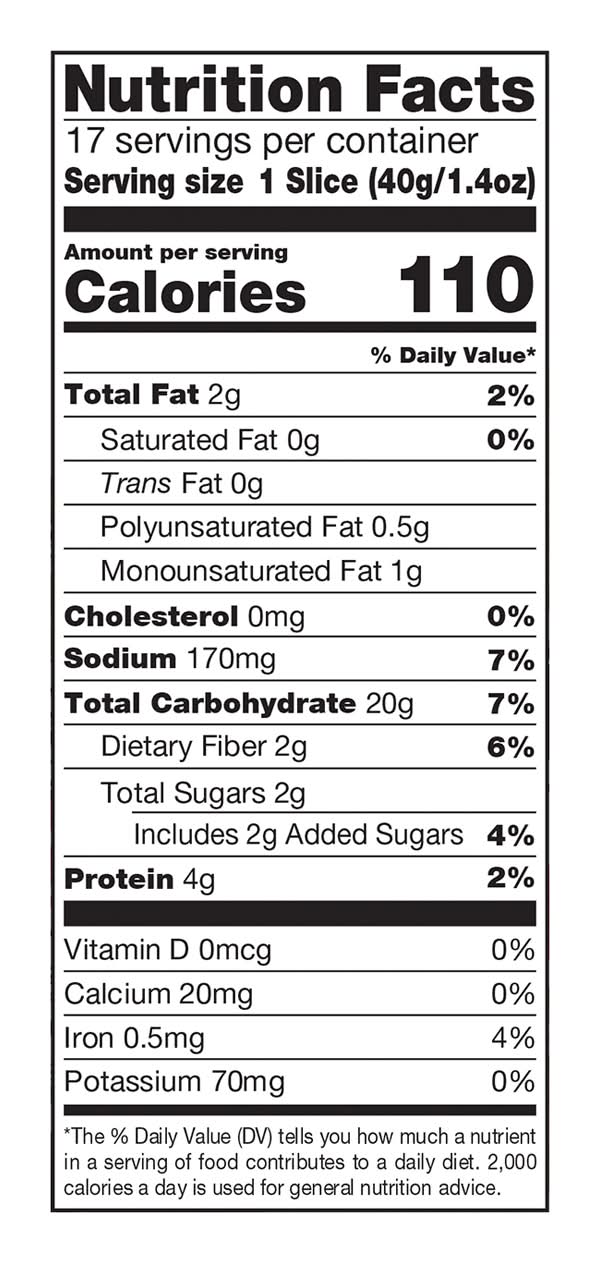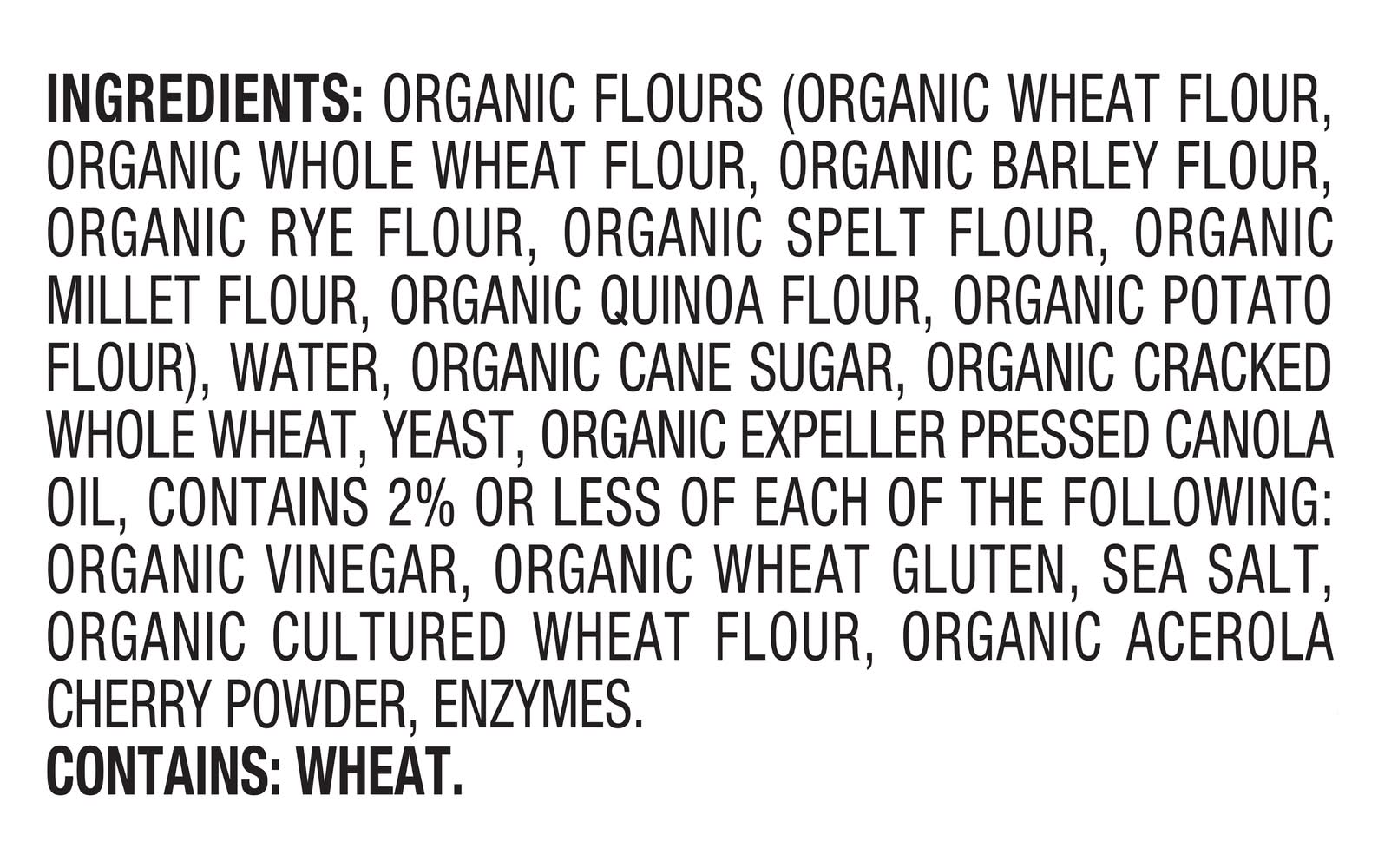Ingredients: Organic Flours (Organic Wheat Flour, Organic Whole Wheat Flour, Organic Barley Flour, Organic Rye Flour, Organic Spelt Flour, Organic Millet Flour, Organic Quinoa Flour, Organic Potato Flour), Water, Organic Cane Sugar, Organic Cracked Whole Wheat, Yeast, Organic Expeller Pressed Canola Oil, Contains 2% or Less of Each of the Following: Organic Vinegar, Organic Wheat Gluten, Sea Salt, Organic Cultured Wheat Flour, Organic Acerola Cherry Powder, Enzymes Contains: Wheat, Gluten, Barley