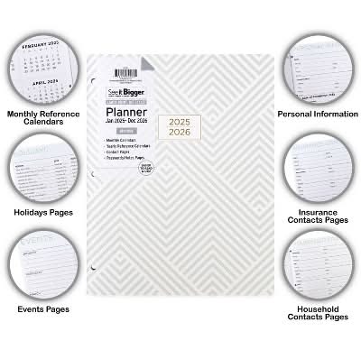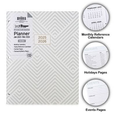 The See It Bigger Monthly 2-Year Planner combines large, easy-to-read print with ample writing space. This planner is large sized (8.5" x 11") with individual monthly pages featuring abundant space to enter important dates and information, making it far different from other planners. There is even a dedicated, lined space along the right margin to jot down notes and tasks. Holiday lIstings make future planning simple, while dedicated note pages put all information at your fingertips. A durable, flexible cover protects all contents while its slim profile slips easily into almost any place, whether a purse, backpack, tote, briefcase, or drawer. Ideal for both professional and personal use. Date range covers 24 months from January 2025 - December 2026. size: 8.5" x 11" • Color: Gray/white • Size: 11"x8.5"