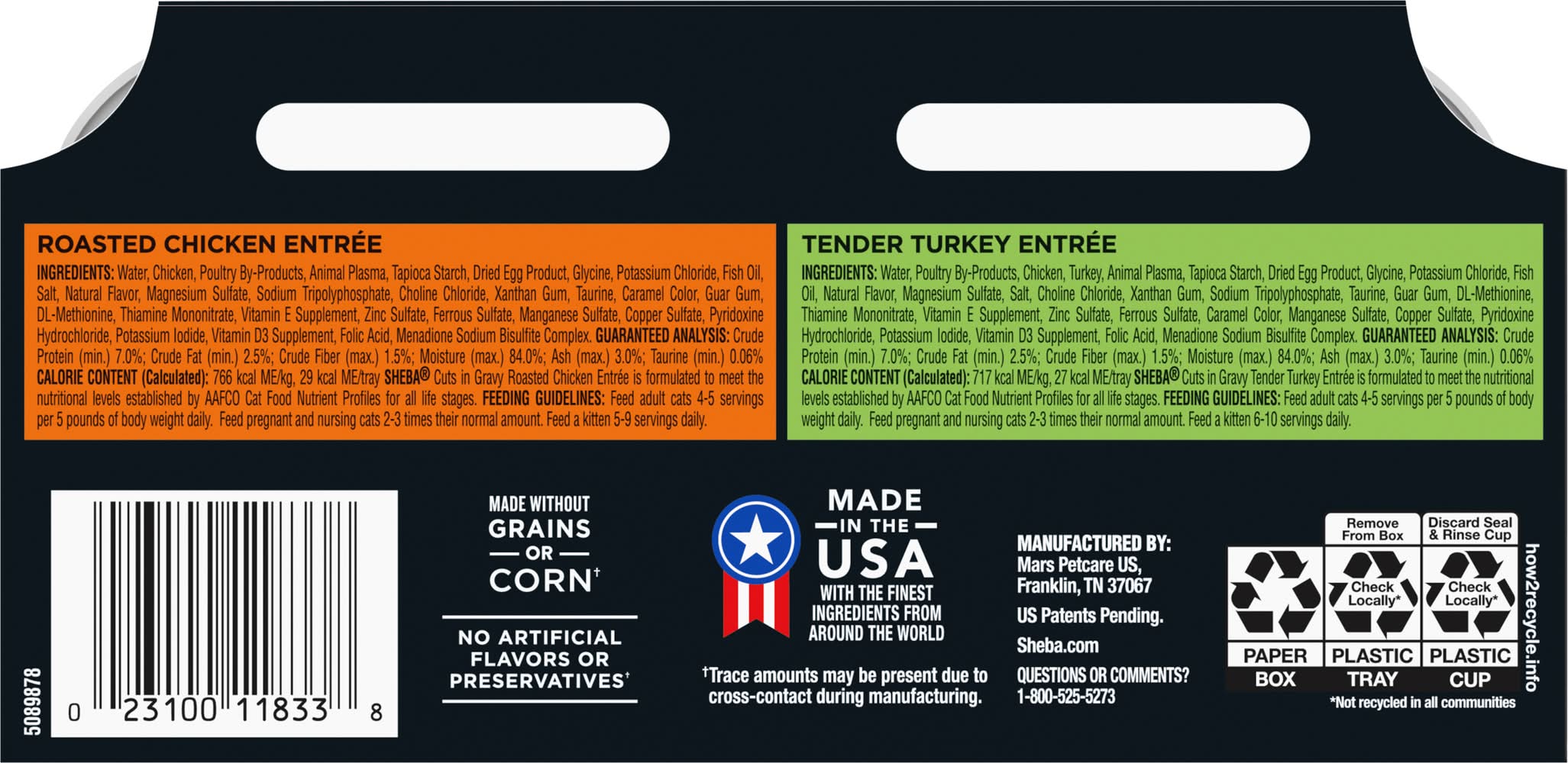 6 Twin-packs Roasted Chicken Entree. 6 Twin-packs Tender Turkey Entree. • Pack size: 12 • Mars Petcare US, Franklin, TN, 37067 • Packaging: Reusable