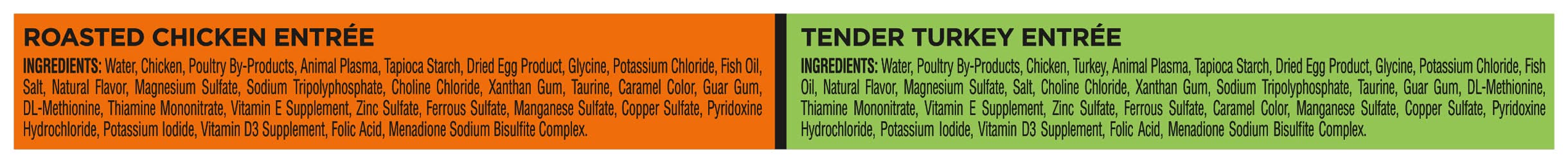 Ingredients: Roasted Chicken Entree: Water, Chicken, Poultry By-Products, Animal Plasma, Tapioca Starch, Dried Egg Product, Glycine, Potassium Chloride, Fish Oil, Salt, Natural Flavor, Magnesium Sulfate, Sodium Tripolyphosphate, Choline Chloride, Xanthan Gum, Taurine, Caramel Color, Guar Gum, DL-Methionine, Thiamine Mononitrate, Vitamin E Supplement, Zinc Sulfate, Ferrous Sulfate, Manganese Sulfate, Copper Sulfate, Pyridoxine Hydrochloride, Potassium Iodide, Vitamin D3 Supplement, Folic Acid, Menadione Sodium Bisulfite Complex. Tender Turkey Entree: Water, Poultry By-Products, Chicken, Turkey, Animal Plasma, Tapioca Starch, Dried Egg Product, Glycine, Potassium Chloride, Fish Oil, Natural Flavor, Magnesium Sulfate, Salt, Choline Chloride, Xanthan Gum, Sodium Tripolyphosphate, Taurine, Guar Gum, DL-Methionine, Thiamine Mononitrate, Vitamin E Supplement, Zinc Sulfate, Ferrous Sulfate, Caramel Color, Manganese Sulfate, Copper Sulfate, Pyridoxine Hydrochloride, Potassium Iodide, Vitamin D3 Supplement, Folic Acid, Menadione Sodium Bisulfite Complex Contains: Eggs, Fish, Sulfites