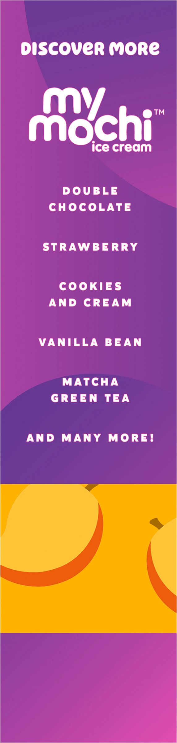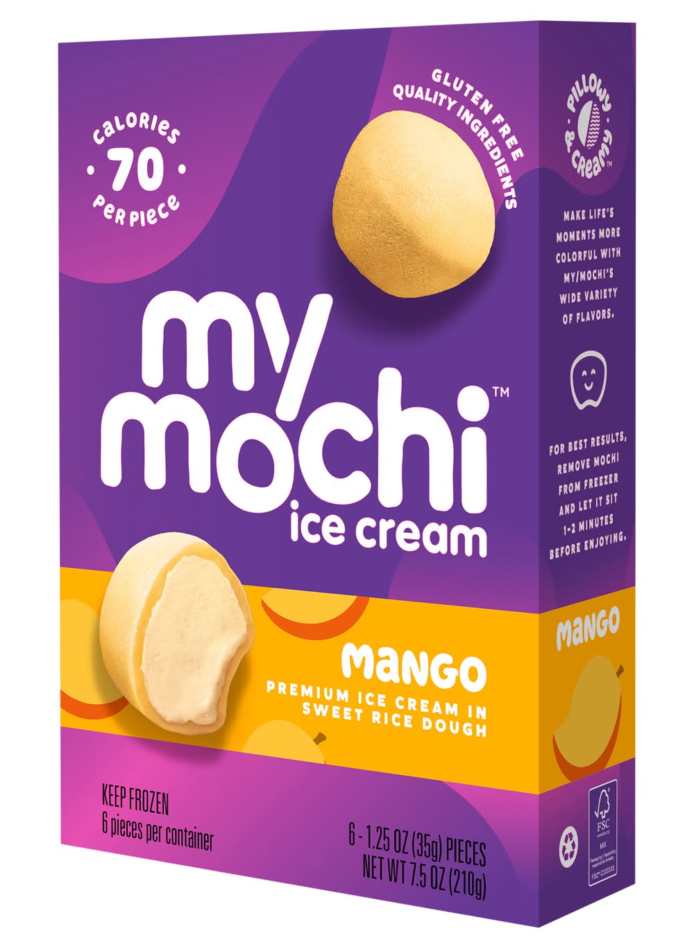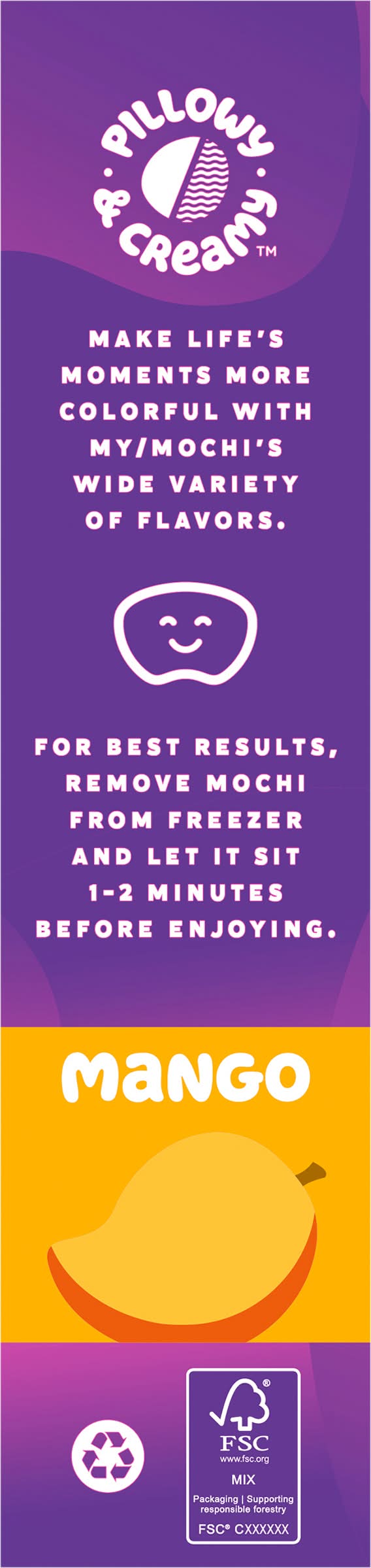 Premium Ice Cream in Sweet Rice Dough Pillowy & Creamy Get Ready for Things to Get a Little Weird "What?" Turns to "Woah" Real Quick When You Take a Bite of My/Mochi - It's Creamy Ice Cream Snuggled Inside Pillowy Rice Dough for Unprecedented Puffnificence. Weird, Right? It Just Works Why Make Ice Cream that's Chewy? Well, Why Not? It Makes No Sense so Don't Think About it Too Hard. Just Ride the Wave of Desquishious Satisnacktion and Ignore the Fact that We Made up a Bunch of Words. Made with Milk from Cows Not Treated with rBST No significant difference has been shown between milk derived from rBST treated and non-rBST treated cows. • Flavor: Sweet mango • Packaging: Reusable